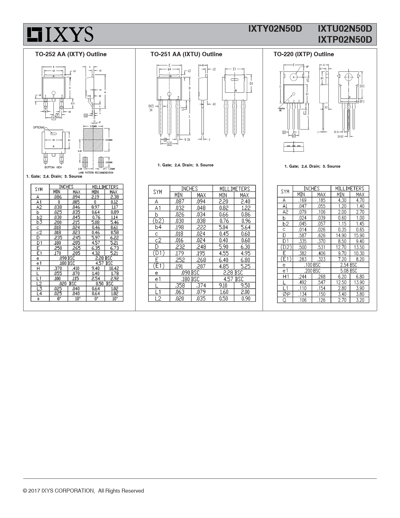 IXTY02N50D IXTU02N50D IXTP02N50D TO-252 AA (IXTY) Outline TO-251 AA (IXTU) Outline TO-220 (IXTP) Outline 1. Gate; 2,4. Drain; 3. Source 1. Gate; 2,4. Drain; 3. Source 1. Gate; 2,4. Drain; 3. Source