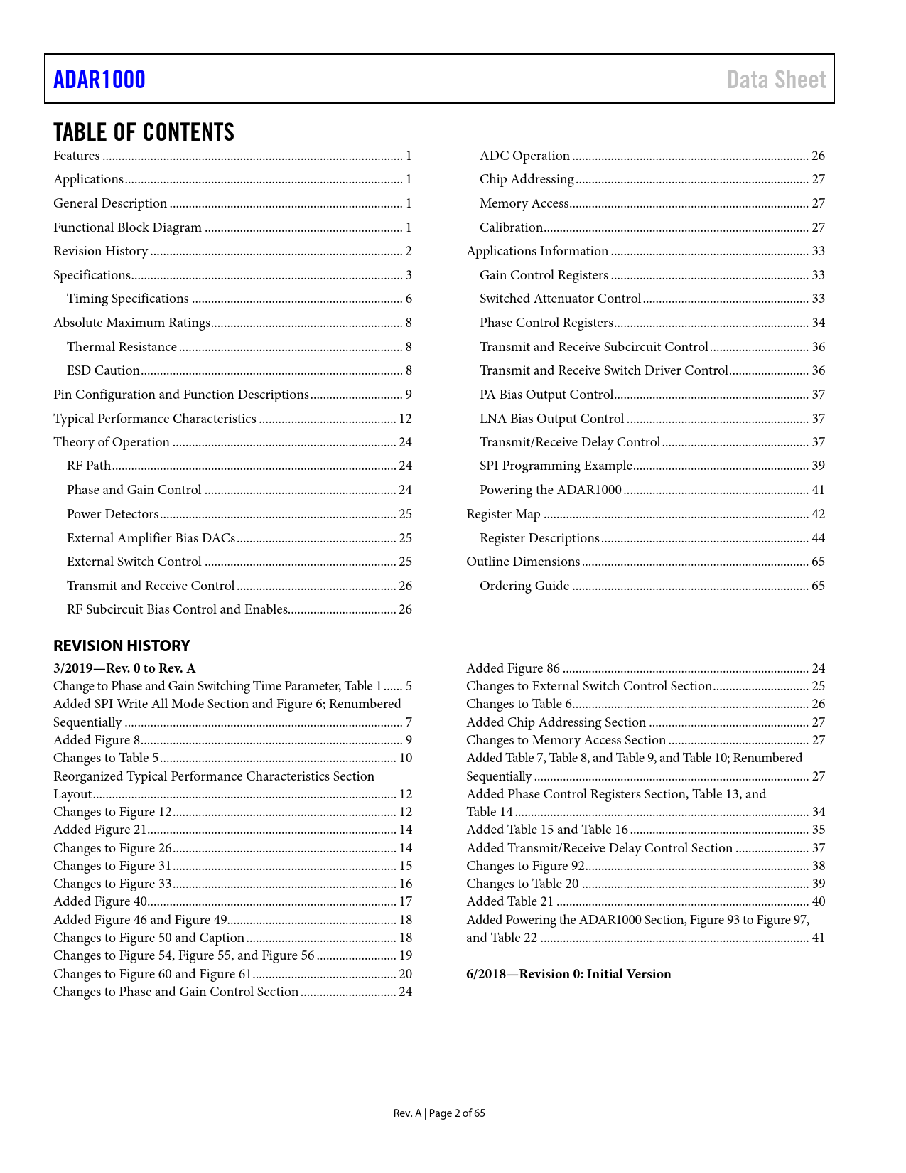 link to page 1 link to page 1 link to page 1 link to page 1 link to page 2 link to page 3 link to page 6 link to page 8 link to page 8 link to page 8 link to page 9 link to page 12 link to page 24 link to page 24 link to page 25 link to page 25 link to page 25 link to page 25 link to page 26 link to page 26 link to page 26 link to page 27 link to page 27 link to page 27 link to page 33 link to page 33 link to page 33 link to page 34 link to page 36 link to page 36 link to page 37 link to page 37 link to page 37 link to page 39 link to page 41 link to page 42 link to page 44 link to page 65 link to page 65 ADAR1000Data SheetTABLE OF CONTENTS Features .. 1 ADC Operation .. 26 Applications ... 1 Chip Addressing ... 27 General Description ... 1 Memory Access ... 27 Functional Block Diagram .. 1 Calibration... 27 Revision History ... 2 Applications Information .. 33 Specifications ... 3 Gain Control Registers .. 33 Timing Specifications .. 6 Switched Attenuator Control .. 33 Absolute Maximum Ratings .. 8 Phase Control Registers ... 34 Thermal Resistance .. 8 Transmit and Receive Subcircuit Control ... 36 ESD Caution .. 8 Transmit and Receive Switch Driver Control ... 36 Pin Configuration and Function Descriptions ... 9 PA Bias Output Control ... 37 Typical Performance Characteristics ... 12 LNA Bias Output Control ... 37 Theory of Operation .. 24 Transmit/Receive Delay Control .. 37 RF Path ... 24 SPI Programming Example ... 39 Phase and Gain Control .. 24 Powering the ADAR1000 .. 41 Power Detectors .. 25 Register Map ... 42 External Amplifier Bias DACs .. 25 Register Descriptions ... 44 External Switch Control .. 25 Outline Dimensions ... 65 Transmit and Receive Control .. 26 Ordering Guide .. 65 RF Subcircuit Bias Control and Enables.. 26 REVISION HISTORY 3/2019—Rev. 0 to Rev. A Added Figure 86 ... 24 Change to Phase and Gain Switching Time Parameter, Table 1 .. 5 Changes to External Switch Control Section .. 25 Added SPI Write Al Mode Section and Figure 6; Renumbered Changes to Table 6 .. 26 Sequentially ... 7 Added Chip Addressing Section .. 27 Added Figure 8 .. 9 Changes to Memory Access Section .. 27 Changes to Table 5 .. 10 Added Table 7, Table 8, and Table 9, and Table 10; Renumbered Reorganized Typical Performance Characteristics Section Sequentially .. 27 Layout ... 12 Added Phase Control Registers Section, Table 13, and Changes to Figure 12 .. 12 Table 14 .. 34 Added Figure 21 .. 14 Added Table 15 and Table 16 .. 35 Changes to Figure 26 .. 14 Added Transmit/Receive Delay Control Section ... 37 Changes to Figure 31 .. 15 Changes to Figure 92 .. 38 Changes to Figure 33 .. 16 Changes to Table 20 ... 39 Added Figure 40 .. 17 Added Table 21 ... 40 Added Figure 46 and Figure 49... 18 Added Powering the ADAR1000 Section, Figure 93 to Figure 97, Changes to Figure 50 and Caption ... 18 and Table 22 .. 41 Changes to Figure 54, Figure 55, and Figure 56 ... 19 Changes to Figure 60 and Figure 61 ... 20 6/2018—Revision 0: Initial Version Changes to Phase and Gain Control Section .. 24 Rev. A | Page 2 of 65 Document Outline Features Applications General Description Functional Block Diagram Revision History Specifications Timing Specifications Timing Diagrams SPI Block Write Mode SPI Write All Mode Absolute Maximum Ratings Thermal Resistance ESD Caution Pin Configuration and Function Descriptions Typical Performance Characteristics Theory of Operation RF Path Phase and Gain Control Power Detectors External Amplifier Bias DACs External Switch Control Transmit and Receive Control RF Subcircuit Bias Control and Enables ADC Operation Chip Addressing Memory Access Calibration Applications Information Gain Control Registers Switched Attenuator Control Phase Control Registers Transmit and Receive Subcircuit Control TR_SOURCE = 1 (TR Pin Control) TR_SOURCE = 0 (SPI Control) Transmit and Receive Switch Driver Control PA Bias Output Control LNA Bias Output Control Transmit/Receive Delay Control Transmit and Receive Mode Switching SPI Programming Example Powering the ADAR1000 Register Map Register Descriptions Outline Dimensions Ordering Guide