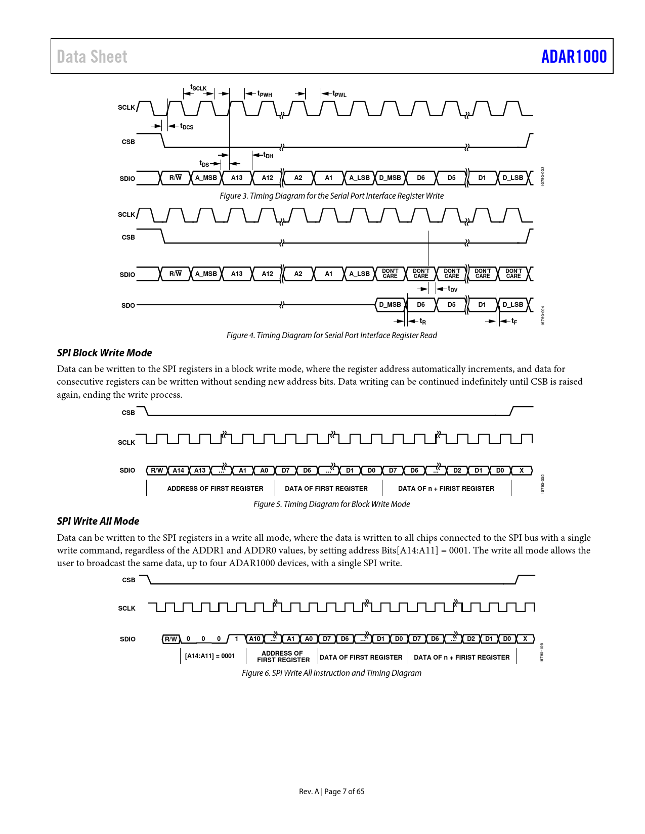16790- Figure 6. SPI Write All Instruction and Timing Diagram Rev. A | Page 7 of 65 Document Outline Features Applications General Description Functional Block Diagram Revision History Specifications Timing Specifications Timing Diagrams SPI Block Write Mode SPI Write All Mode Absolute Maximum Ratings Thermal Resistance ESD Caution Pin Configuration and Function Descriptions Typical Performance Characteristics Theory of Operation RF Path Phase and Gain Control Power Detectors External Amplifier Bias DACs External Switch Control Transmit and Receive Control RF Subcircuit Bias Control and Enables ADC Operation Chip Addressing Memory Access Calibration Applications Information Gain Control Registers Switched Attenuator Control Phase Control Registers Transmit and Receive Subcircuit Control TR_SOURCE = 1 (TR Pin Control) TR_SOURCE = 0 (SPI Control) Transmit and Receive Switch Driver Control PA Bias Output Control LNA Bias Output Control Transmit/Receive Delay Control Transmit and Receive Mode Switching SPI Programming Example Powering the ADAR1000 Register Map Register Descriptions Outline Dimensions Ordering Guide