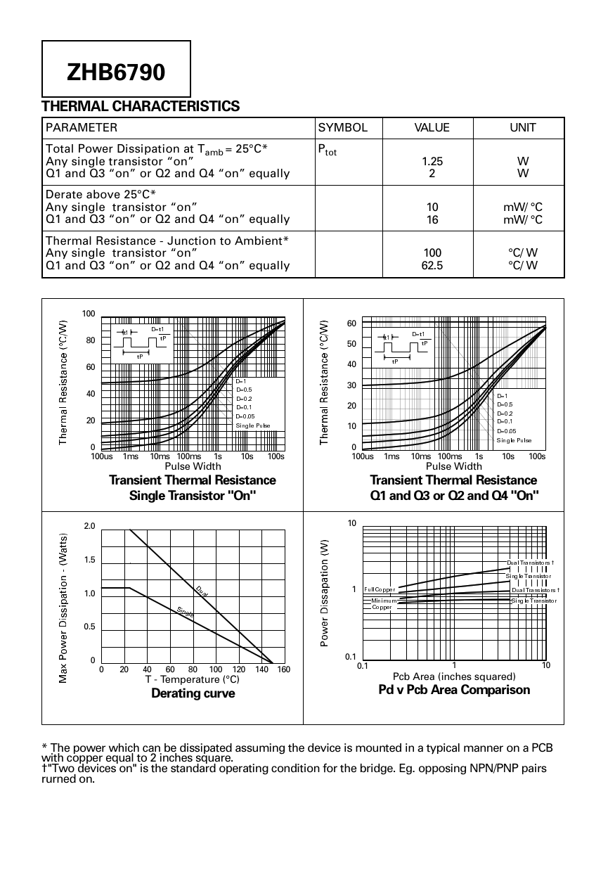 ZHB6790 THERMAL CHARACTERISTICS PARAMETER SYMBOL VALUE UNIT Total Power Dissipation at Tamb = 25°C* Ptot Any single transistor on 1.25 W Q1 and Q3 on or Q2 and Q4 on equally 2 W Derate above 25°C* Any single transistor on 10 mW/ °C Q1 and Q3 on or Q2 and Q4 on equally 16 mW/ °C Thermal Resistance - Junction to Ambient* Any single transistor on 100 °C/ W Q1 and Q3 on or Q2 and Q4 on equally 62.5 °C/ W 100 60 D=t1 t1 D=t1 tP 80 t1 tP 50 tP tP 60 40 D=1 30 D=0.5 40 D=0.2 D=1 D=0.1 D=0.5 20 D=0.05 D=0.2 20 D=0.1 Single Pulse 10 D=0.05 Single Pulse 0 0 100us 1ms 10ms 100ms 1s 10s 100s 100us 1ms 10ms 100ms 1s 10s 100s Pulse Width Pulse Width Transient Thermal Resistance Transient Thermal Resistance Single Transistor "On" Q1 and Q3 or Q2 and Q4 "On" 2.0 10 1.5 Dual Transistors Single Transistor 1.0 1 Full Copper Dual Transistors Minimum Single Transistor Copper 0.5 0 0.1 0 20 40 60 80 100 120 140 160 0.1 1 10 T - Temperature (°C) Pcb Area (inches squared) Derating curve Pd v Pcb Area Comparison * The power which can be dissipated assuming the device is mounted in a typical manner on a PCB with copper equal to 2 inches square. "Two devices on" is the standard operating condition for the bridge. Eg. opposing NPN/PNP pairs rurned on.