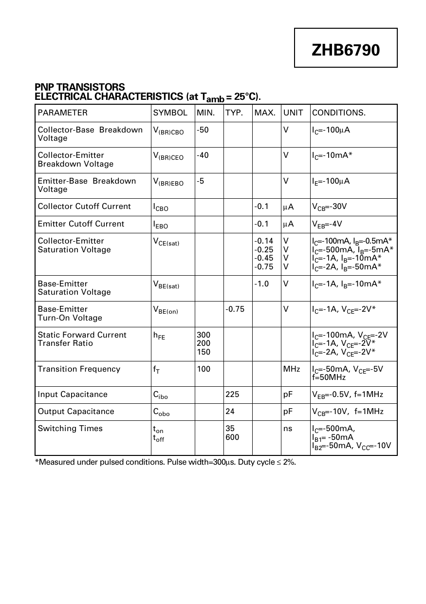 ZHB6790 PNP TRANSISTORS ELECTRICAL CHARACTERISTICS (at Tamb = 25°C). PARAMETER SYMBOL MIN. TYP. MAX. UNIT CONDITIONS. Collector-Base Breakdown V(BR)CBO -50 V IC=-100µA Voltage Collector-Emitter V(BR)CEO -40 V IC=-10mA* Breakdown Voltage Emitter-Base Breakdown V(BR)EBO -5 V IE=-100µA Voltage Collector Cutoff Current ICBO -0.1 µA VCB=-30V Emitter Cutoff Current IEBO -0.1 µA VEB=-4V Collector-Emitter VCE(sat) -0.14 V IC=-100mA, IB=-0.5mA* Saturation Voltage -0.25 V IC=-500mA, IB=-5mA* -0.45 V IC=-1A, IB=-10mA* -0.75 V IC=-2A, IB=-50mA* Base-Emitter VBE(sat) -1.0 V IC=-1A, IB=-10mA* Saturation Voltage Base-Emitter VBE(on) -0.75 V IC=-1A, VCE=-2V* Turn-On Voltage Static Forward Current hFE 300 IC=-100mA, VCE=-2V Transfer Ratio 200 IC=-1A, VCE=-2V* 150 IC=-2A, VCE=-2V* Transition Frequency fT 100 MHz IC=-50mA, VCE=-5V f=50MHz Input Capacitance Cibo 225 pF VEB=-0.5V, f=1MHz Output Capacitance Cobo 24 pF VCB=-10V, f=1MHz Switching Times ton 35 ns IC=-500mA, toff 600 IB1= -50mA IB2=-50mA, VCC=-10V *Measured under pulsed conditions. Pulse width=300µs. Duty cycle ≤ 2%.