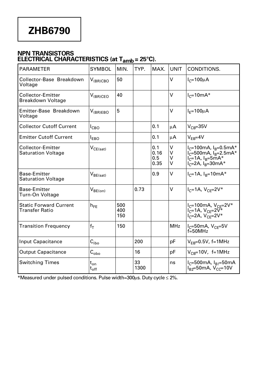 ZHB6790 NPN TRANSISTORS ELECTRICAL CHARACTERISTICS (at Tamb = 25°C). PARAMETER SYMBOL MIN. TYP. MAX. UNIT CONDITIONS. Collector-Base Breakdown V(BR)CBO 50 V IC=100µA Voltage Collector-Emitter V(BR)CEO 40 V IC=10mA* Breakdown Voltage Emitter-Base Breakdown V(BR)EBO 5 V IE=100µA Voltage Collector Cutoff Current ICBO 0.1 µA VCB=35V Emitter Cutoff Current IEBO 0.1 µA VEB=4V Collector-Emitter VCE(sat) 0.1 V IC=100mA, IB=0.5mA* Saturation Voltage 0.16 V IC=500mA, IB=2.5mA* 0.5 V IC=1A, IB=5mA* 0.35 V IC=2A, IB=30mA* Base-Emitter VBE(sat) 0.9 V IC=1A, IB=10mA* Saturation Voltage Base-Emitter VBE(on) 0.73 V IC=1A, VCE=2V* Turn-On Voltage Static Forward Current hFE 500 IC=100mA, VCE=2V* Transfer Ratio 400 IC=1A, VCE=2V* 150 IC=2A, VCE=2V* Transition Frequency fT 150 MHz IC=50mA, VCE=5V f=50MHz Input Capacitance Cibo 200 pF VEB=0.5V, f=1MHz Output Capacitance Cobo 16 pF VCB=10V, f=1MHz Switching Times ton 33 ns IC=500mA, IB!=50mA toff 1300 IB2=50mA, VCC=10V *Measured under pulsed conditions. Pulse width=300µs. Duty cycle ≤ 2%.