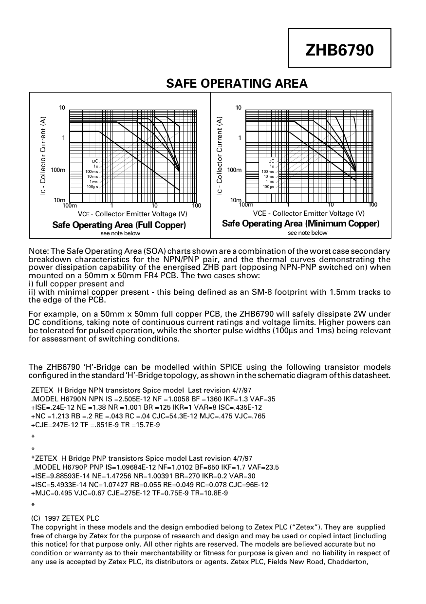 ZHB6790 SAFE OPERATING AREA 10 10 1 1 DC DC 1s 1s 100m 100ms 100m 100ms 10ms 10ms 1ms 1ms 100µs 100µs 10m 10m 100m 1 10 100 100m 1 10 100 VCE - Collector Emitter Voltage (V) VCE - Collector Emitter Voltage (V) Safe Operating Area (Full Copper) Safe Operating Area (Minimum Copper) see note below see note below Note: The Safe Operating Area (SOA) charts shown are a combination of the worst case secondary breakdown characteristics for the NPN/PNP pair, and the thermal curves demonstrating the power dissipation capability of the energised ZHB part (opposing NPN-PNP switched on) when mounted on a 50mm x 50mm FR4 PCB. The two cases show: i) full copper present and ii) with minimal copper present - this being defined as an SM-8 footprint with 1.5mm tracks to the edge of the PCB. For example, on a 50mm x 50mm full copper PCB, the ZHB6790 will safely dissipate 2W under DC conditions, taking note of continuous current ratings and voltage limits. Higher powers can be tolerated for pulsed operation, while the shorter pulse widths (100µs and 1ms) being relevant for assessment of switching conditions. The ZHB6790 H-Bridge can be modelled within SPICE using the following transistor models configured in the standard H-Bridge topology, as shown in the schematic diagram of this datasheet. ZETEX H Bridge NPN transistors Spice model Last revision 4/7/97 .MODEL H6790N NPN IS =2.505E-12 NF =1.0058 BF =1360 IKF=1.3 VAF=35 +ISE=.24E-12 NE =1.38 NR =1.001 BR =125 IKR=1 VAR=8 ISC=.435E-12 +NC =1.213 RB =.2 RE =.043 RC =.04 CJC=54.3E-12 MJC=.475 VJC=.765 +CJE=247E-12 TF =.851E-9 TR =15.7E-9 * * *ZETEX H Bridge PNP transistors Spice model Last revision 4/7/97 .MODEL H6790P PNP IS=1.09684E-12 NF=1.0102 BF=650 IKF=1.7 VAF=23.5 +ISE=9.88593E-14 NE=1.47256 NR=1.00391 BR=270 IKR=0.2 VAR=30 +ISC=5.4933E-14 NC=1.07427 RB=0.055 RE=0.049 RC=0.078 CJC=96E-12 +MJC=0.495 VJC=0.67 CJE=275E-12 TF=0.75E-9 TR=10.8E-9 * (C) 1997 ZETEX PLC The copyright in these models and the design embodied belong to Zetex PLC (Zetex). They are supplied free of charge by Zetex for the purpose of research and design and may be used or copied intact (including this notice) for that purpose only. All other rights are reserved. The models are believed accurate but no condition or warranty as to their merchantability or fitness for purpose is given and no liability in respect of any use is accepted by Zetex PLC, its distributors or agents. Zetex PLC, Fields New Road, Chadderton,