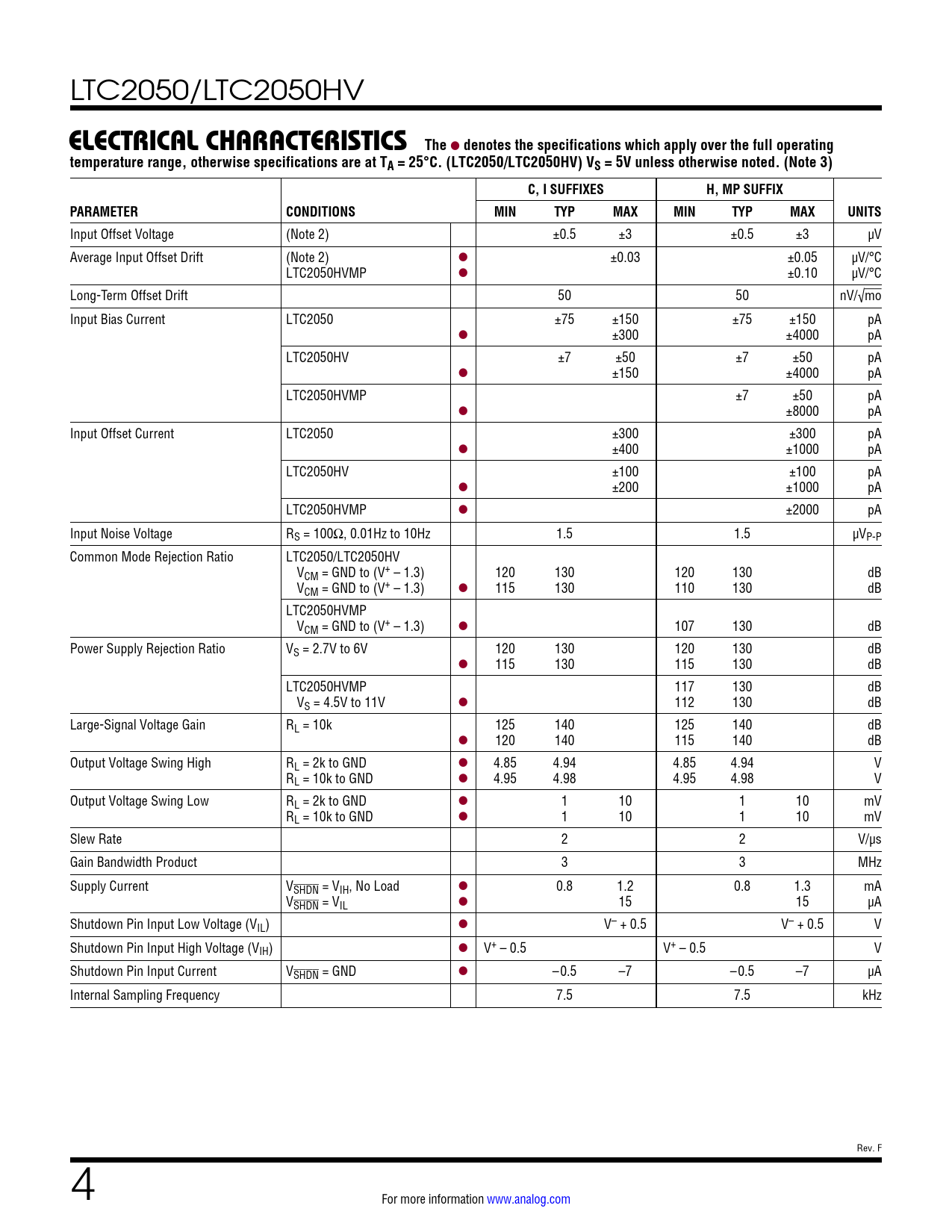 LTC2050/LTC2050HV ELECTRICAL CHARACTERISTICSThe l denotes the specifications which apply over the full operatingtemperature range, otherwise specifications are at TA = 25°C. (LTC2050/LTC2050HV) VS = 5V unless otherwise noted. (Note 3)C, I SUFFIXESH, MP SUFFIXPARAMETERCONDITIONSMINTYPMAXMINTYPMAXUNITS Input Offset Voltage (Note 2) ±0.5 ±3 ±0.5 ±3 µV Average Input Offset Drift (Note 2) l ±0.03 ±0.05 µV/°C LTC2050HVMP l ±0.10 µV/°C Long-Term Offset Drift 50 50 nV/√mo Input Bias Current LTC2050 ±75 ±150 ±75 ±150 pA l ±300 ±4000 pA LTC2050HV ±7 ±50 ±7 ±50 pA l ±150 ±4000 pA LTC2050HVMP ±7 ±50 pA l ±8000 pA Input Offset Current LTC2050 ±300 ±300 pA l ±400 ±1000 pA LTC2050HV ±100 ±100 pA l ±200 ±1000 pA LTC2050HVMP l ±2000 pA Input Noise Voltage RS = 100Ω, 0.01Hz to 10Hz 1.5 1.5 µVP-P Common Mode Rejection Ratio LTC2050/LTC2050HV VCM = GND to (V+ – 1.3) 120 130 120 130 dB VCM = GND to (V+ – 1.3) l 115 130 110 130 dB LTC2050HVMP VCM = GND to (V+ – 1.3) l 107 130 dB Power Supply Rejection Ratio VS = 2.7V to 6V 120 130 120 130 dB l 115 130 115 130 dB LTC2050HVMP 117 130 dB VS = 4.5V to 11V l 112 130 dB Large-Signal Voltage Gain RL = 10k 125 140 125 140 dB l 120 140 115 140 dB Output Voltage Swing High RL = 2k to GND l 4.85 4.94 4.85 4.94 V RL = 10k to GND l 4.95 4.98 4.95 4.98 V Output Voltage Swing Low RL = 2k to GND l 1 10 1 10 mV RL = 10k to GND l 1 10 1 10 mV Slew Rate 2 2 V/µs Gain Bandwidth Product 3 3 MHz Supply Current VSHDN = VIH, No Load l 0.8 1.2 0.8 1.3 mA VSHDN = VIL l 15 15 µA Shutdown Pin Input Low Voltage (VIL) l V– + 0.5 V– + 0.5 V Shutdown Pin Input High Voltage (VIH) l V+ – 0.5 V+ – 0.5 V Shutdown Pin Input Current VSHDN = GND l –0.5 –7 –0.5 –7 µA Internal Sampling Frequency 7.5 7.5 kHz Rev. F 4 For more information www.analog.com Document Outline Features Applications Typical Application Description Absolute Maximum Ratings Pin Configuration Order Information Electrical Characteristics Typical Performance Characteristics Test Circuits Applications Information Typical Applications Package Description Revision History Typical Application Related Parts