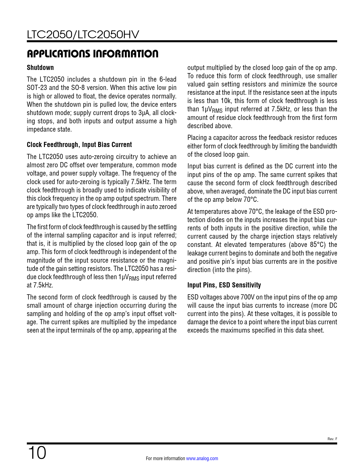 APPLICATIONS INFORMATION Shutdown Clock Feedthrough, Input Bias Current Input Pins, ESD Sensitivity