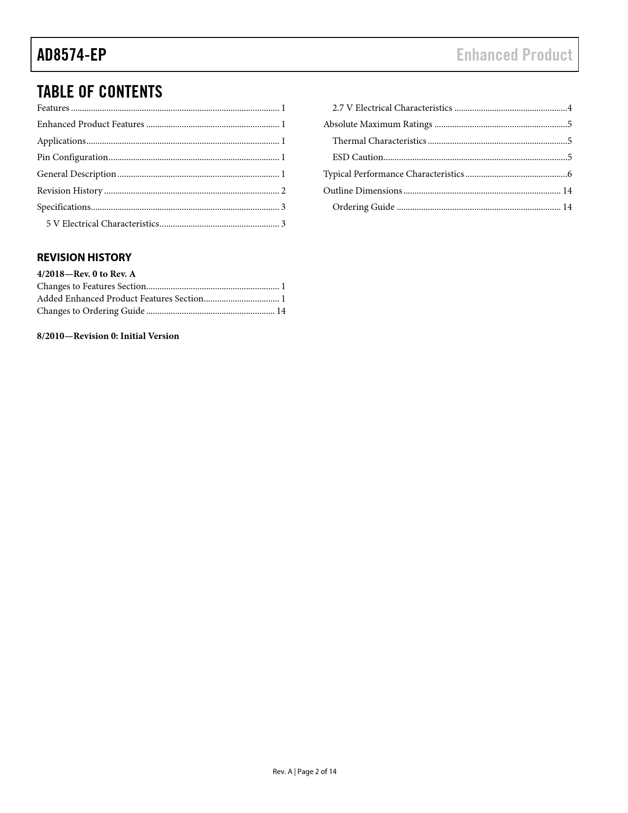 页数 / 页14 / 2 — AD8574-EP. Enhanced Product. TABLE OF CONTENTS. REVISION HISTORY. …