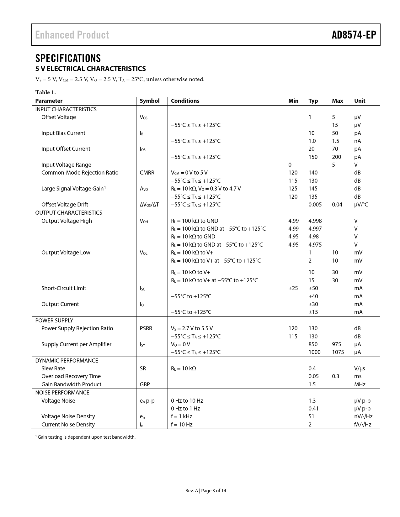 页数 / 页14 / 3 — Enhanced Product. AD8574-EP. SPECIFICATIONS 5 V ELECTRICAL …