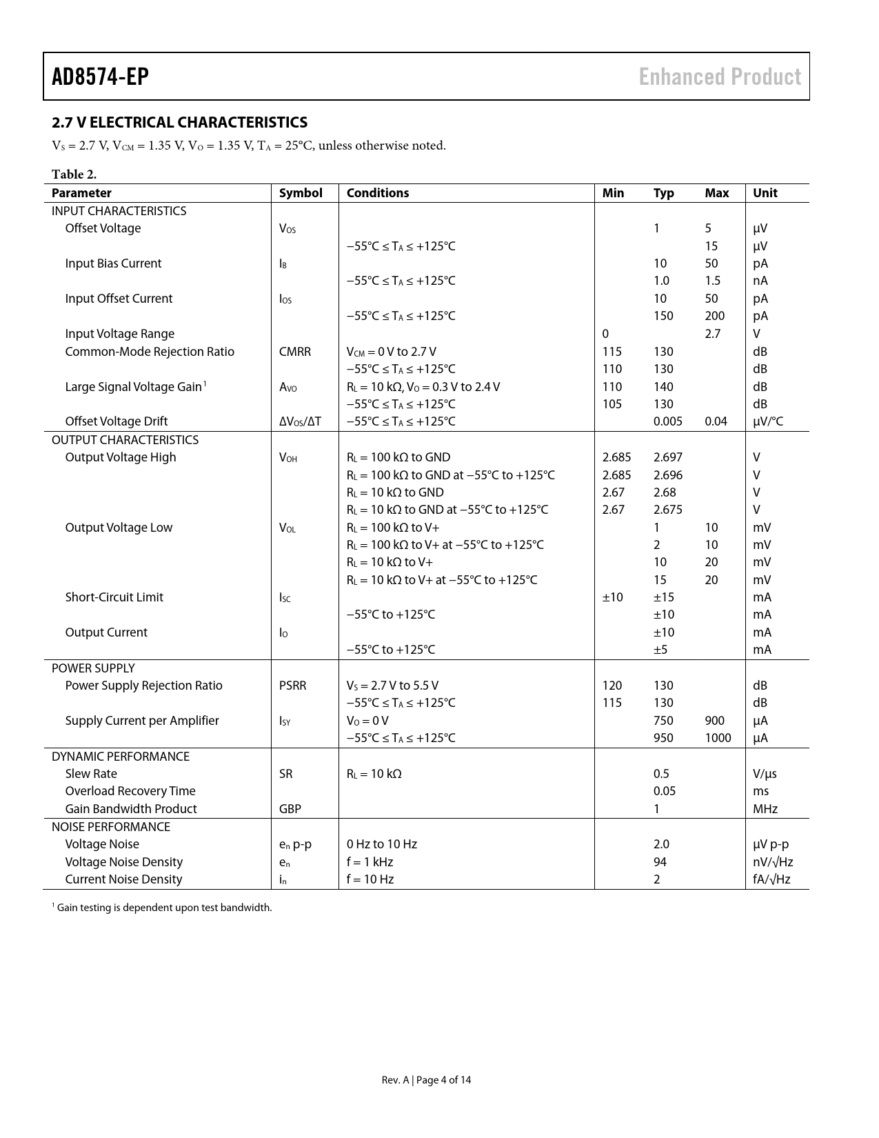 AD8574-EP. Enhanced Product. 2.7 V ELECTRICAL CHARACTERISTICS. Table 2. Parameter. Symbol. Conditions. Min. Typ. Max. Unit