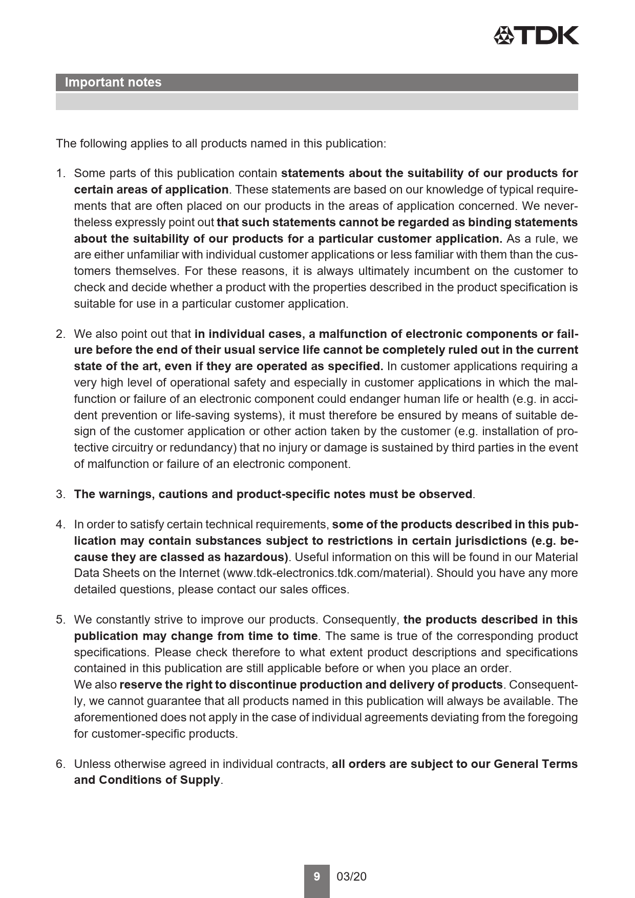 . Useful information on this will be found in our Material Data Sheets on the Internet (www.tdk-electronics.tdk.com/material). Should you have any more detailed questions, please contact our sales offices. 5. We constantly strive to improve our products. Consequently,