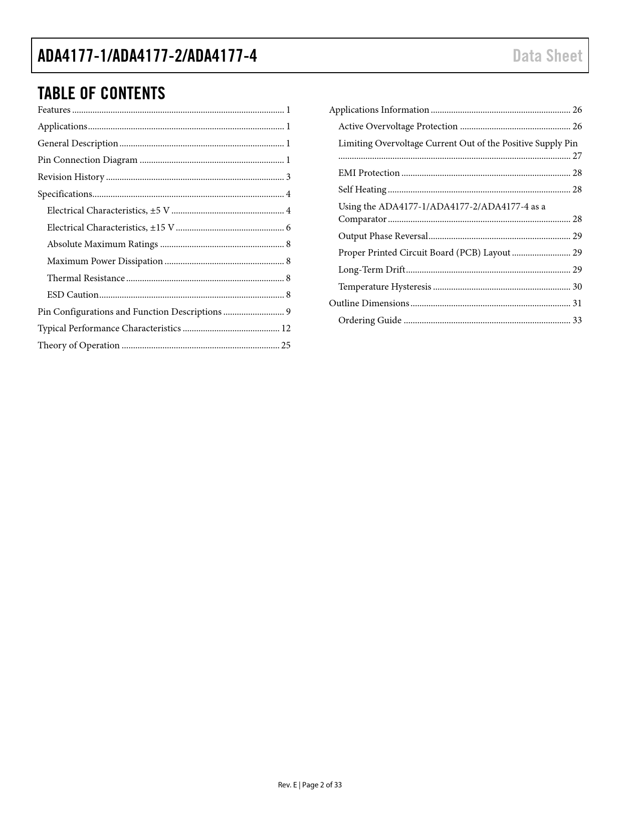 link to page 1 link to page 1 link to page 1 link to page 1 link to page 3 link to page 4 link to page 4 link to page 6 link to page 8 link to page 8 link to page 8 link to page 8 link to page 9 link to page 12 link to page 25 link to page 26 link to page 26 link to page 27 link to page 27 link to page 28 link to page 28 link to page 28 link to page 28 link to page 29 link to page 29 link to page 29 link to page 30 link to page 31 link to page 33 ADA4177-1/ADA4177-2/ADA4177-4Data SheetTABLE OF CONTENTS Features .. 1 Applications Information .. 26 Applications ... 1 Active Overvoltage Protection ... 26 General Description ... 1 Limiting Overvoltage Current Out of the Positive Supply Pin Pin Connection Diagram .. 1 ... 27 Revision History ... 3 EMI Protection ... 28 Specifications ... 4 Self Heating ... 28 Electrical Characteristics, ±5 V .. 4 Using the ADA4177-1/ADA4177-2/ADA4177-4 as a Comparator ... 28 Electrical Characteristics, ±15 V .. 6 Output Phase Reversal ... 29 Absolute Maximum Ratings ... 8 Proper Printed Circuit Board (PCB) Layout .. 29 Maximum Power Dissipation ... 8 Long-Term Drift ... 29 Thermal Resistance .. 8 Temperature Hysteresis ... 30 ESD Caution .. 8 Outline Dimensions ... 31 Pin Configurations and Function Descriptions ... 9 Ordering Guide .. 33 Typical Performance Characteristics ... 12 Theory of Operation .. 25 Rev. E | Page 2 of 33 Document Outline Features Applications General Description Pin Connection Diagram Revision History Specifications Electrical Characteristics, ±5 V Electrical Characteristics, ±15 V Absolute Maximum Ratings Maximum Power Dissipation Thermal Resistance ESD Caution Pin Configurations and Function Descriptions Typical Performance Characteristics Theory of Operation Applications Information Active Overvoltage Protection Common Protection Methods Add an External Series Input Resistor Add External Clamping Diodes Input Protection Circuit Limiting Overvoltage Current Out of the Positive Supply Pin EMI Protection Self Heating Using the ADA4177-1/ADA4177-2/ADA4177-4 as a Comparator Output Phase Reversal Proper Printed Circuit Board (PCB) Layout Long-Term Drift Temperature Hysteresis Outline Dimensions Ordering Guide