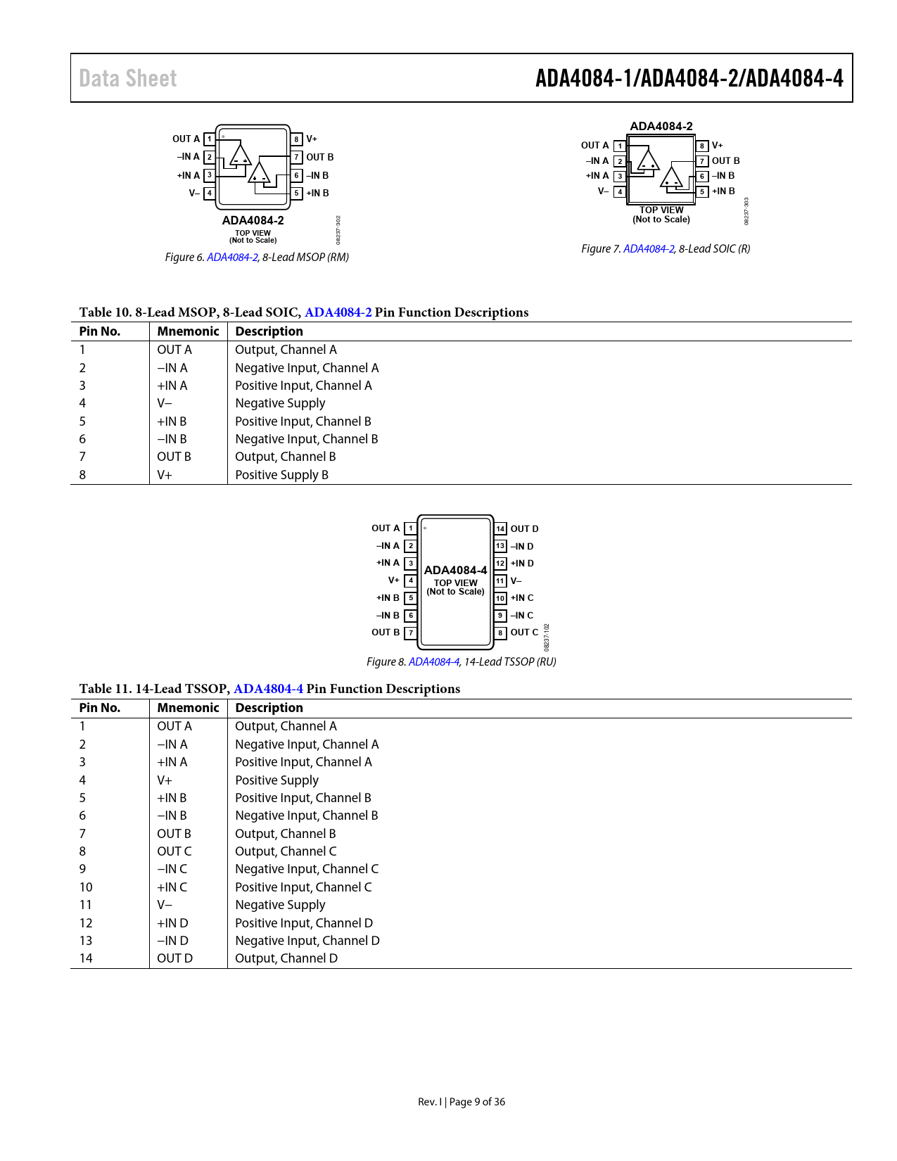 Table 10. 8-Lead MSOP, 8-Lead SOIC, ADA4084-2 Pi n Function Descriptions Pin No. Mnemonic Description