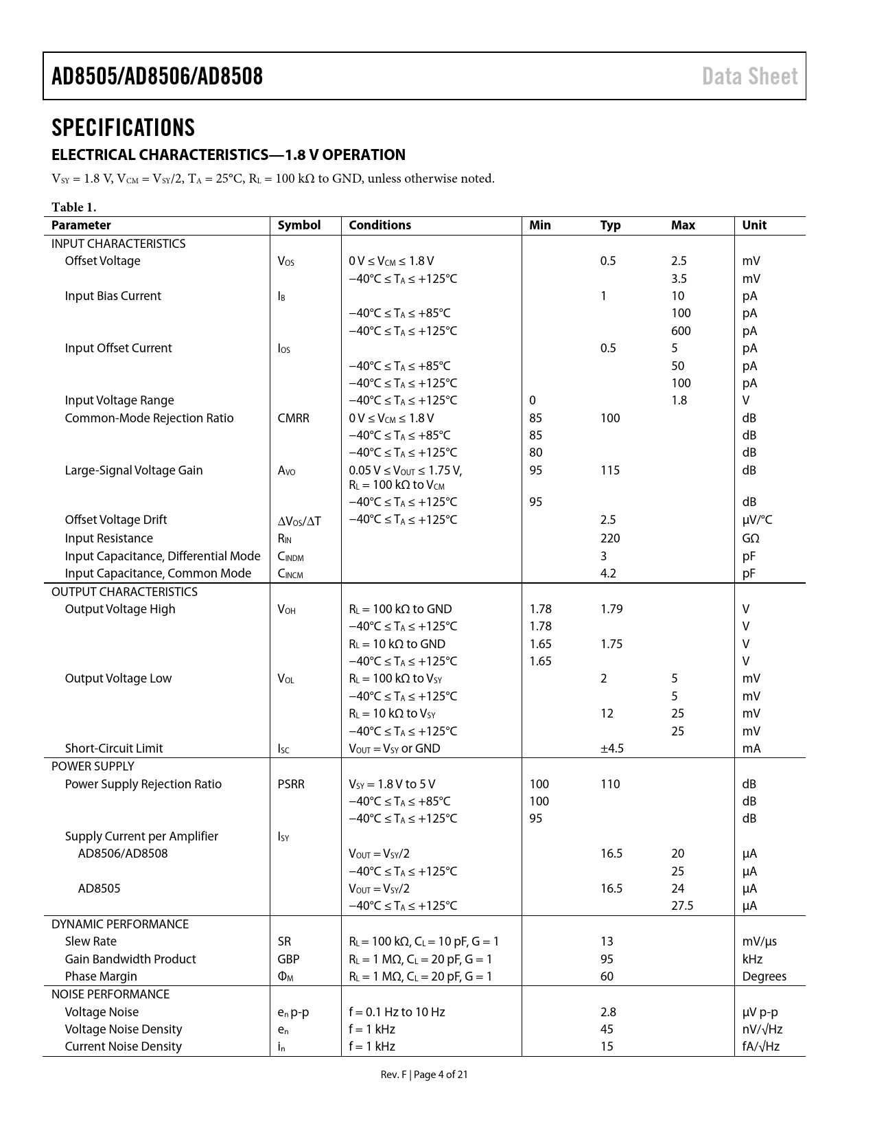 AD8505/AD8506/AD8508Data SheetSPECIFICATIONS ELECTRICAL CHARACTERISTICS—1.8 V OPERATION VSY = 1.8 V, VCM = VSY/2, TA = 25°C, RL = 100 kΩ to GND, unless otherwise noted. Table 1. ParameterSymbolConditionsMinTypMaxUnit INPUT CHARACTERISTICS Offset Voltage VOS 0 V ≤ VCM ≤ 1.8 V 0.5 2.5 mV −40°C ≤ TA ≤ +125°C 3.5 mV Input Bias Current IB 1 10 pA −40°C ≤ TA ≤ +85°C 100 pA −40°C ≤ TA ≤ +125°C 600 pA Input Offset Current IOS 0.5 5 pA −40°C ≤ TA ≤ +85°C 50 pA −40°C ≤ TA ≤ +125°C 100 pA Input Voltage Range −40°C ≤ TA ≤ +125°C 0 1.8 V Common-Mode Rejection Ratio CMRR 0 V ≤ VCM ≤ 1.8 V 85 100 dB −40°C ≤ TA ≤ +85°C 85 dB −40°C ≤ TA ≤ +125°C 80 dB Large-Signal Voltage Gain AVO 0.05 V ≤ VOUT ≤ 1.75 V, 95 115 dB RL = 100 kΩ to VCM −40°C ≤ TA ≤ +125°C 95 dB Offset Voltage Drift ∆VOS/∆T −40°C ≤ TA ≤ +125°C 2.5 µV/°C Input Resistance RIN 220 GΩ Input Capacitance, Differential Mode CINDM 3 pF Input Capacitance, Common Mode CINCM 4.2 pF OUTPUT CHARACTERISTICS Output Voltage High VOH RL = 100 kΩ to GND 1.78 1.79 V −40°C ≤ TA ≤ +125°C 1.78 V RL = 10 kΩ to GND 1.65 1.75 V −40°C ≤ TA ≤ +125°C 1.65 V Output Voltage Low VOL RL = 100 kΩ to VSY 2 5 mV −40°C ≤ TA ≤ +125°C 5 mV RL = 10 kΩ to VSY 12 25 mV −40°C ≤ TA ≤ +125°C 25 mV Short-Circuit Limit ISC VOUT = VSY or GND ±4.5 mA POWER SUPPLY Power Supply Rejection Ratio PSRR VSY = 1.8 V to 5 V 100 110 dB −40°C ≤ TA ≤ +85°C 100 dB −40°C ≤ TA ≤ +125°C 95 dB Supply Current per Amplifier ISY AD8506/AD8508 VOUT = VSY/2 16.5 20 µA −40°C ≤ TA ≤ +125°C 25 µA AD8505 VOUT = VSY/2 16.5 24 µA −40°C ≤ TA ≤ +125°C 27.5 µA DYNAMIC PERFORMANCE Slew Rate SR RL = 100 kΩ, CL = 10 pF, G = 1 13 mV/µs Gain Bandwidth Product GBP RL = 1 MΩ, CL = 20 pF, G = 1 95 kHz Phase Margin ΦM RL = 1 MΩ, CL = 20 pF, G = 1 60 Degrees NOISE PERFORMANCE Voltage Noise en p-p f = 0.1 Hz to 10 Hz 2.8 µV p-p Voltage Noise Density en f = 1 kHz 45 nV/√Hz Current Noise Density in f = 1 kHz 15 fA/√Hz Rev. F | Page 4 of 21 Document Outline Features Applications General Description Pin Configurations Revision History Specifications Electrical Characteristics—1.8 V Operation Electrical Characteristics—5 V Operation Absolute Maximum Ratings Thermal Resistance ESD Caution Typical Performance Characteristics Theory of Operation Applications Information Pulse Oximeter Current Source Four-Pole, Low-Pass Butterworth Filter for Glucose Monitor Outline Dimensions Ordering Guide