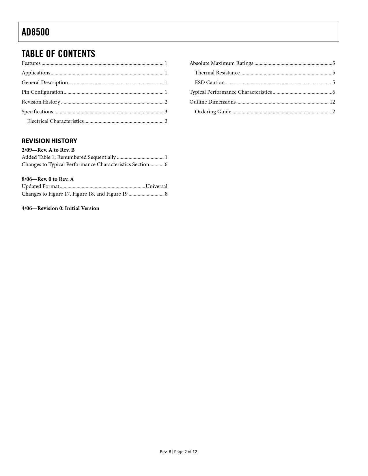 link to page 1 link to page 1 link to page 1 link to page 1 link to page 1 link to page 1 link to page 1 link to page 1 link to page 2 link to page 2 link to page 3 link to page 3 link to page 3 link to page 3 link to page 5 link to page 5 link to page 5 link to page 5 link to page 5 link to page 5 link to page 6 link to page 6 link to page 12 link to page 12 link to page 12 link to page 12 AD8500TABLE OF CONTENTS Features .. 1 Absolute Maximum Ratings ..5 Applications ... 1 Thermal Resistance ...5 General Description ... 1 ESD Caution...5 Pin Configuration ... 1 Typical Performance Characteristics ..6 Revision History ... 2 Outline Dimensions ... 12 Specifications ... 3 Ordering Guide .. 12 Electrical Characteristics ... 3 REVISION HISTORY2/09—Rev. A to Rev. B Added Table 1; Renumbered Sequentially .. 1 Changes to Typical Performance Characteristics Section ... 6 8/06—Rev. 0 to Rev. A Updated Format .. Universal Changes to Figure 17, Figure 18, and Figure 19 ... 8 4/06—Revision 0: Initial Version Rev. B | Page 2 of 12 Document Outline FEATURES APPLICATIONS PIN CONFIGURATION GENERAL DESCRIPTION TABLE OF CONTENTS REVISION HISTORY SPECIFICATIONS ABSOLUTE MAXIMUM RATINGS THERMAL RESISTANCE ESD CAUTION TYPICAL PERFORMANCE CHARACTERISTICS OUTLINE DIMENSIONS ORDERING GUIDE