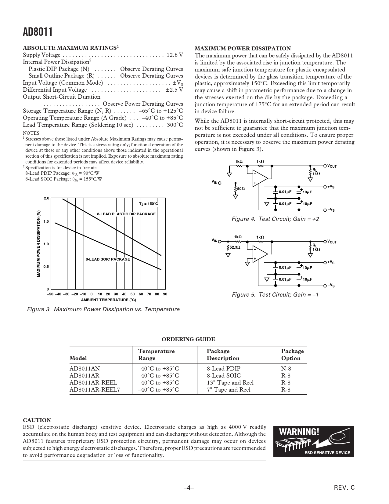 AD8011. ABSOLUTE MAXIMUM RATINGS1. MAXIMUM POWER DISSIPATION. OUT. VIN. 0.01. 2.0. TJ = 150. –VS. 8-LEAD PLASTIC DIP PACKAGE. 1.5. VOUT. 1.0
