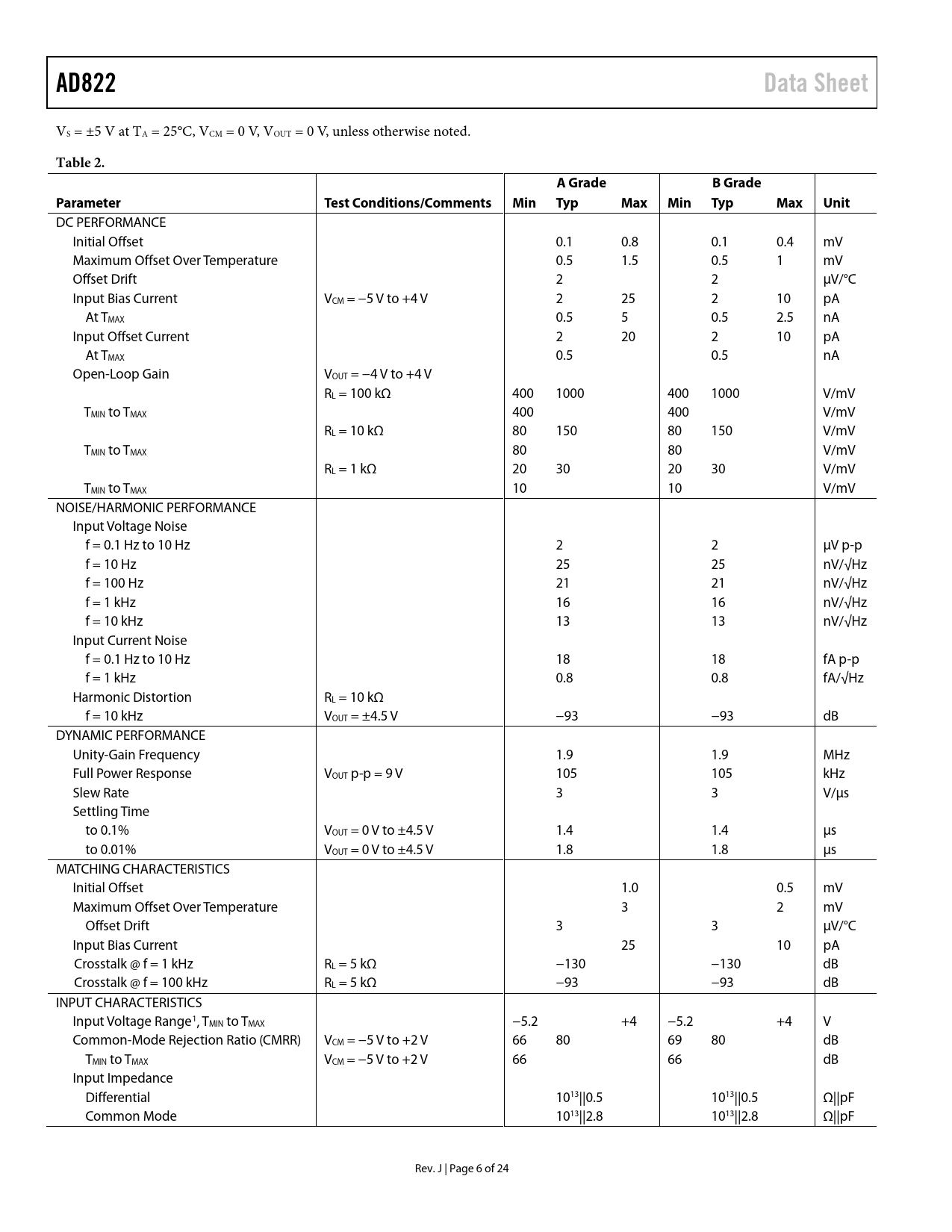 AD822. Data Sheet. Table 2. A Grade. B Grade. Parameter. Test Conditions/Comments. Min. Typ. Max. Unit