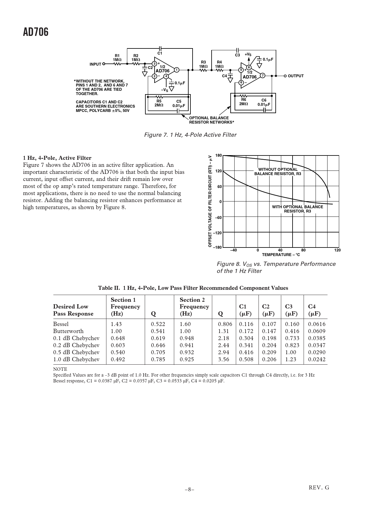 link to page 8 link to page 8 AD706C1R1R2C3+VS1M1M0.1FR3R4INPUT3 +1/2C21M1M815 +AD7061/22 –4C47OUTPUTAD706*WITHOUT THE NETWORK,0.16 –FPINS 1 AND 2, AND 6 AND 7 OF THE AD706 ARE TIED–VSTOGETHER.R6C6CAPACITORS C1 AND C2R5C52M0.01FARE SOUTHERN ELECTRONICS2M0.01FMPCC, POLYCARB5%, 50VOPTIONAL BALANCE RESISTOR NETWORKS* Figure 7. 1 Hz, 4-Pole Active Filter 1 Hz, 4-Pole, Active Filter180V Figure 7 shows the AD706 in an active filter application. An important characteristic of the AD706 is that both the input bias 120WITHOUT OPTIONALBALANCE RESISTOR, R3 current, input offset current, and their drift remain low over most of the op amp’s rated temperature range. Therefore, for 60 most applications, there is no need to use the normal balancing resistor. Adding the balancing resistor enhances performance at 0 high temperatures, as shown by Figure 8. WITH OPTIONAL BALANCERESISTOR, R3–60–120OFFSET VOLTAGE OF FILTER CIRCUIT (RTI) – –180–4004080120TEMPERATURE –C Figure 8. VOS vs. Temperature Performance of the 1 Hz Filter Table II. 1 Hz, 4-Pole, Low Pass Filter Recommended Component ValuesSection 1Section 2Desired LowFrequencyFrequencyC1C2C3C4Pass Response(Hz)Q(Hz)Q(F)(F)(F)(F) Bessel 1.43 0.522 1.60 0.806 0.116 0.107 0.160 0.0616 Butterworth 1.00 0.541 1.00 1.31 0.172 0.147 0.416 0.0609 0.1 dB Chebychev 0.648 0.619 0.948 2.18 0.304 0.198 0.733 0.0385 0.2 dB Chebychev 0.603 0.646 0.941 2.44 0.341 0.204 0.823 0.0347 0.5 dB Chebychev 0.540 0.705 0.932 2.94 0.416 0.209 1.00 0.0290 1.0 dB Chebychev 0.492 0.785 0.925 3.56 0.508 0.206 1.23 0.0242 NOTE Specified Values are for a –3 dB point of 1.0 Hz. For other frequencies simply scale capacitors C1 through C4 directly, i.e. for 3 Hz Bessel response, C1 = 0.0387 µF, C2 = 0.0357 µF, C3 = 0.0533 µF, C4 = 0.0205 µF. REV. G –8– Document Outline FEATURES APPLICATIONS CONNECTION DIAGRAM GENERAL DESCRIPTION PRODUCT HIGHLIGHTS SPECIFICATIONS ABSOLUTE MAXIMUM RATINGS METALIZATION PHOTOGRAPH TYPICAL PERFORMANCE CHARACTERISTICS 1 HZ, 4-POLE, ACTIVE FILTER OUTLINE DIMENSIONS ORDERING GUIDE REVISION HISTORY