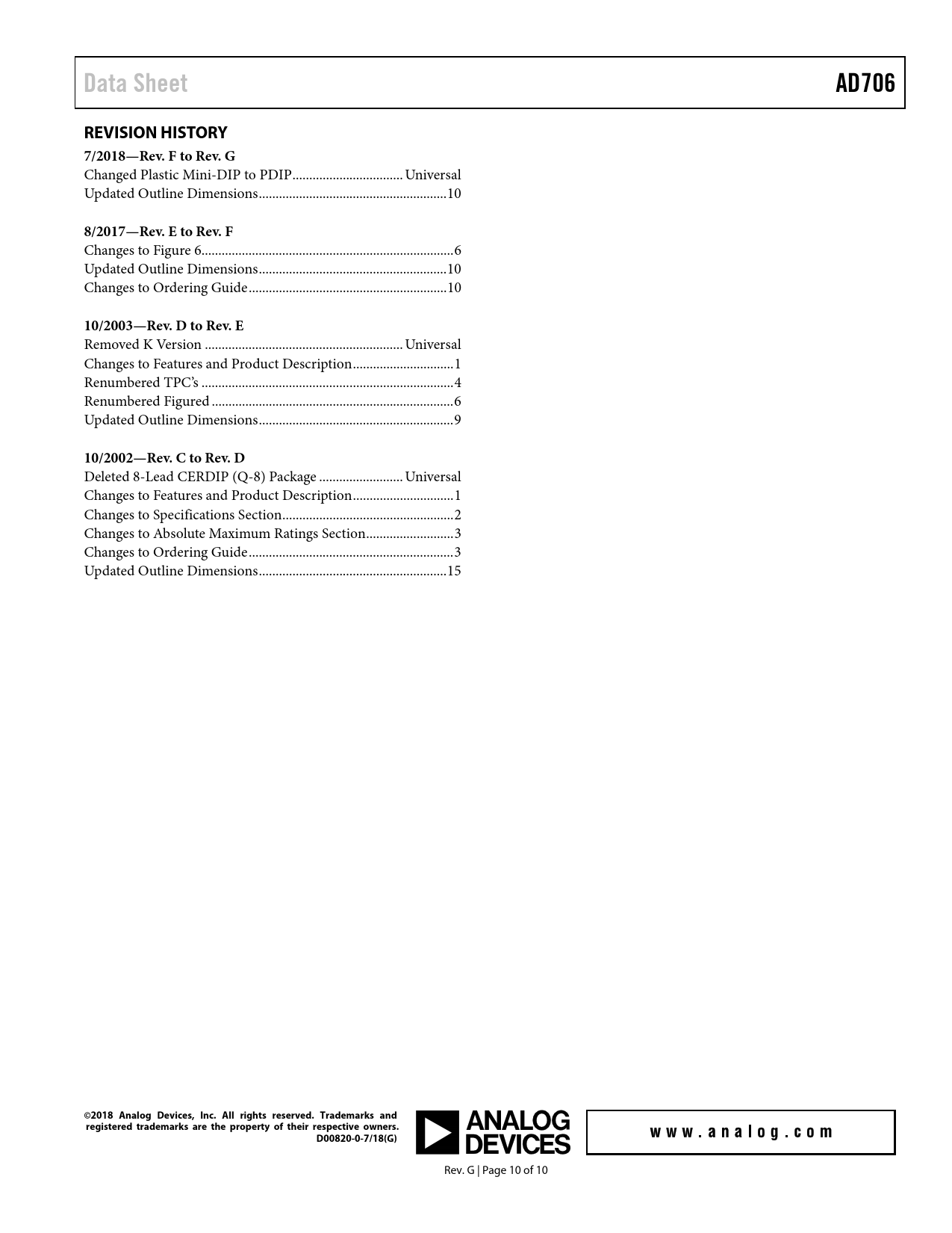 | 页数 / 页 | 10 / 10 — Data Sheet. AD706. REVISION HISTORY. 7/2018—Rev. F to Rev. G. 8/2017—Rev. … |