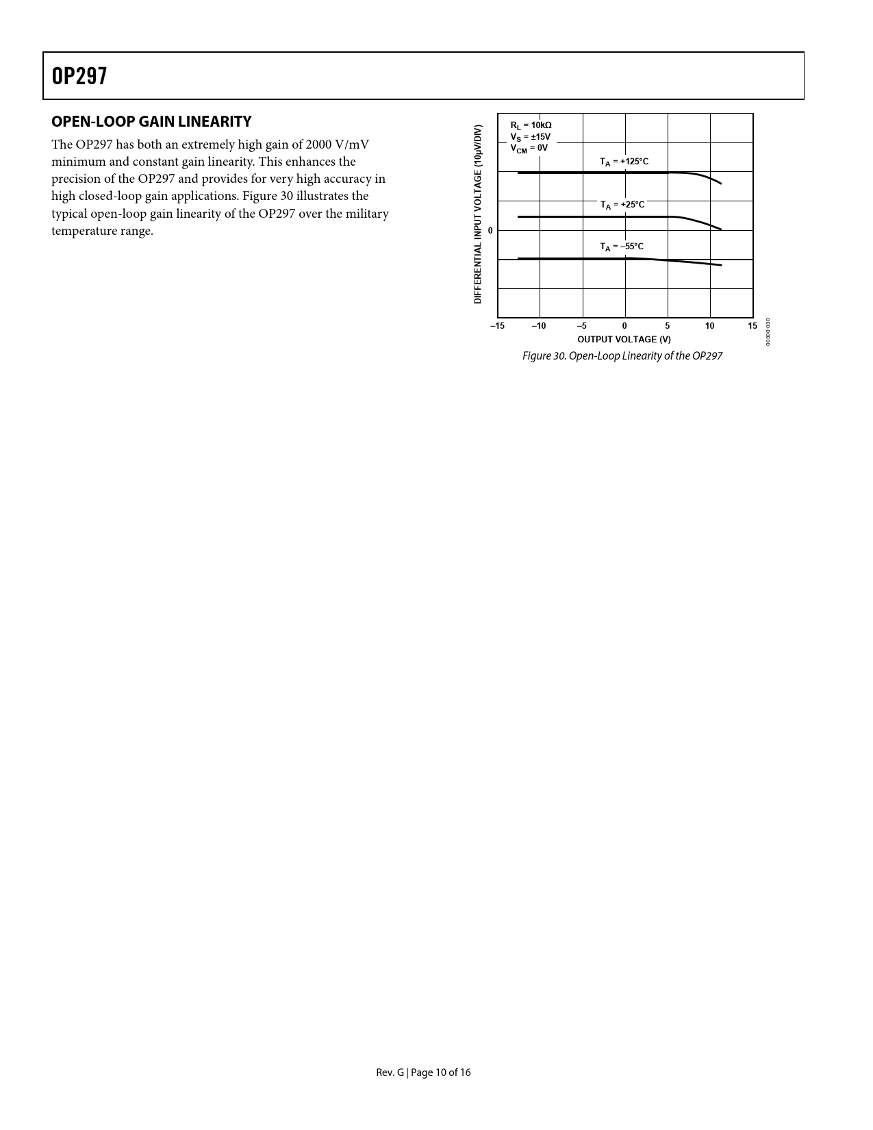 link to page 10 OP297OPEN-LOOP GAIN LINEARITYRL = 10kΩIV)V The OP297 has both an extremely high gain of 2000 V/mV /DS = ±15VVVCM = 0V minimum and constant gain linearity. This enhances the 10µTA = +125°CE ( precision of the OP297 and provides for very high accuracy in G A high closed-loop gain applications. Figure 30 illustrates the T LTA = +25°C typical open-loop gain linearity of the OP297 over the military VO T temperature range. PU N 0I LTIAA = –55°CT N E ER F IF D 0 –15–10–5051015 03 0- OUTPUT VOLTAGE (V) 30 00 Figure 30. Open-Loop Linearity of the OP297 Rev. G | Page 10 of 16 Document Outline FEATURES APPLICATIONS GENERAL DESCRIPTION PIN CONFIGURATION TABLE OF CONTENTS REVISION HISTORY SPECIFICATIONS ELECTRICAL CHARACTERISTICS ABSOLUTE MAXIMUM RATINGS THERMAL RESISTANCE ESD CAUTION TYPICAL PERFORMANCE CHARACTERISTICS APPLICATIONS INFORMATION AC PERFORMANCE GUARDING AND SHIELDING OPEN-LOOP GAIN LINEARITY APPLICATION CIRCUITS PRECISION ABSOLUTE VALUE AMPLIFIER PRECISION CURRENT PUMP PRECISION POSITIVE PEAK DETECTOR SIMPLE BRIDGE CONDITIONING AMPLIFIER NONLINEAR CIRCUITS OUTLINE DIMENSIONS ORDERING GUIDE