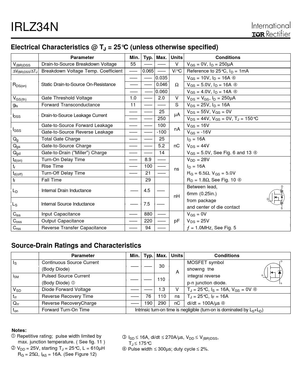 V(BR)DSS Drain-to-Source Breakdown Voltage 55 ––– ––– V VGS = 0V, ID = 250µA ∆V(BR)DSS/∆TJ Breakdown Voltage Temp. Coefficient ––– 0.065 ––– V/°C Reference to 25°C, ID = 1mA ––– ––– 0.035 VGS = 10V, ID = 16A RDS(on) Static Drain-to-Source On-Resistance ––– ––– 0.046 Ω VGS = 5.0V, ID = 16A ––– ––– 0.060 VGS = 4.0V, ID = 14A VGS(th) Gate Threshold Voltage 1.0 ––– 2.0 V VDS = VGS, ID = 250µA gfs Forward Transconductance 11 ––– ––– S VDS = 25V, ID = 16A ––– ––– 25 VDS = 55V, VGS = 0V µA IDSS Drain-to-Source Leakage Current ––– ––– 250 VDS = 44V, VGS = 0V, TJ = 150°C Gate-to-Source Forward Leakage ––– ––– 100 VGS = 16V IGSS nA Gate-to-Source Reverse Leakage ––– ––– -100 VGS = -16V Qg Total Gate Charge ––– ––– 25 ID = 16A Qgs Gate-to-Source Charge ––– ––– 5.2 nC VDS = 44V Qgd Gate-to-Drain ("Miller") Charge ––– ––– 14 VGS = 5.0V, See Fig. 6 and 13 td(on) Turn-On Delay Time ––– 8.9 ––– VDD = 28V tr Rise Time ––– 100 ––– ID = 16A ns td(off) Turn-Off Delay Time ––– 21 ––– RG = 6.5Ω, VGS = 5.0V tf Fall Time ––– 29 ––– RD = 1.8Ω, See Fig. 10 Between lead, D LD Internal Drain Inductance ––– 4.5 ––– 6mm (0.25in.) nH from package G LS Internal Source Inductance ––– 7.5 ––– and center of die contact S Ciss Input Capacitance ––– 880 ––– VGS = 0V Coss Output Capacitance ––– 220 ––– pF VDS = 25V Crss Reverse Transfer Capacitance ––– 94 ––– ƒ = 1.0MHz, See Fig. 5