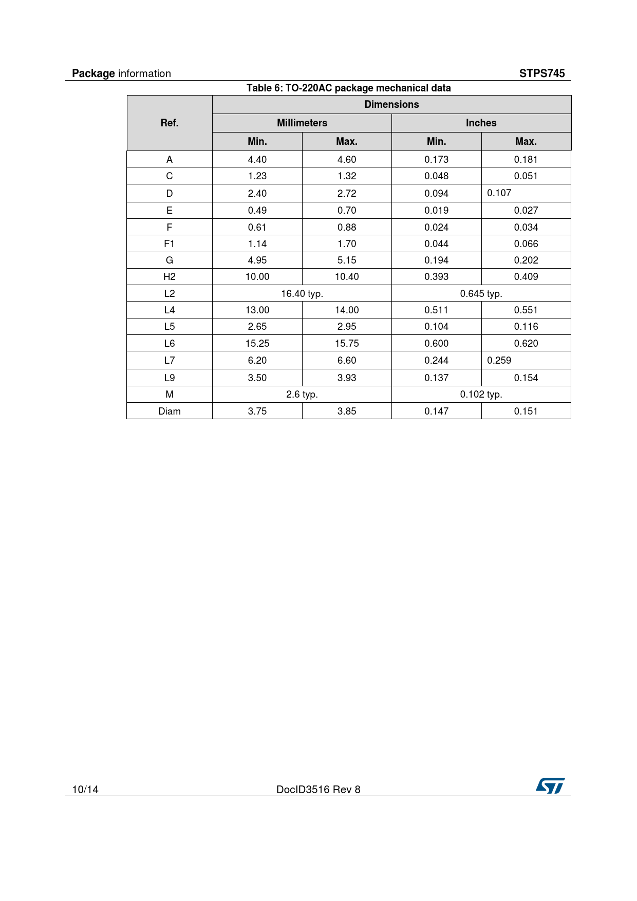 Package. STPS745. Table 6: TO-220AC package mechanical data. Dimensions. Ref. Millimeters. Inches. Min. Max