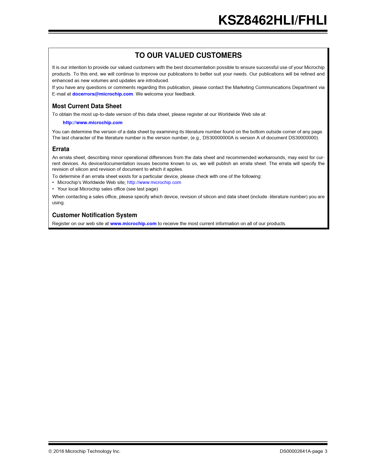 KSZ8462HLI/FHLITO OUR VALUED CUSTOMERS It is our intention to provide our valued customers with the best documentation possible to ensure successful use of your Microchip products. To this end, we will continue to improve our publications to better suit your needs. Our publications will be refined and enhanced as new volumes and updates are introduced. If you have any questions or comments regarding this publication, please contact the Marketing Communications Department via E-mail at docerrors@microchip.com . We welcome your feedback. Most Current Data Sheet To obtain the most up-to-date version of this data sheet, please register at our Worldwide Web site at: http://www.microchip.com You can determine the version of a data sheet by examining its literature number found on the bottom outside corner of any page. The last character of the literature number is the version number, (e.g., DS30000000A is version A of document DS30000000). Errata An errata sheet, describing minor operational differences from the data sheet and recommended workarounds, may exist for cur- rent devices. As device/documentation issues become known to us, we will publish an errata sheet. The errata will specify the revision of silicon and revision of document to which it applies. To determine if an errata sheet exists for a particular device, please check with one of the following: • Microchip’s Worldwide Web site; http://www.microchip.com • Your local Microchip sales office (see last page) When contacting a sales office, please specify which device, revision of silicon and data sheet (include -literature number) you are using. Customer Notification System Register on our web site at www.microchip.com to receive the most current information on all of our products. 2018 Microchip Technology Inc. DS00002641A-page 3 Document Outline 1.0 Introduction 1.1 General Terms and Conditions 1.2 General Description 2.0 Pin Description and Configuration 3.0 Functional Description 3.1 Direction Terminology 3.2 Physical (PHY) Block 3.3 Media Access Controller (MAC) Block 3.4 Switch Block 3.5 Queue Management Unit (QMU) 3.6 IEEE 1588 Precision Time Protocol (PTP) Block 3.7 General Purpose and IEEE 1588 Input/Output (GPIO) 3.8 Using the GPIO Pins with the Trigger Output Units 3.9 Using the GPIO Pins with the Time Stamp Input Units 3.10 Device Clocks 3.11 Power 3.12 Power Management 3.13 Interfaces 4.0 Register Descriptions 4.1 Register Map of CPU Accessible I/O Registers 4.2 Register Bit Definitions 4.3 Management Information Base (MIB) Counters 4.4 Static MAC Address Table 4.5 Dynamic MAC Address Table 4.6 VLAN Table 5.0 Operational Characteristics 5.1 Absolute Maximum Ratings* 5.2 Operating Ratings** 6.0 Electrical Characteristics 7.0 Timing Specifications 7.1 Host Interface Read/Write Timing 7.2 Auto-Negotiation Timing 7.3 Trigger Output Unit and Time Stamp Input Unit Timing 7.4 Serial EEPROM Interface Timing 7.5 Reset and Power Sequence Timing 7.6 Reset Circuit Guidelines 8.0 Reference Circuit: LED Strap-In Pins 9.0 Reference Clock: Connection and Selection 10.0 Selection of Isolation Transformers 11.0 Package Outline Appendix A: Data Sheet Revision History The Microchip Web Site Customer Change Notification Service Customer Support Product Identification System Worldwide Sales and Service