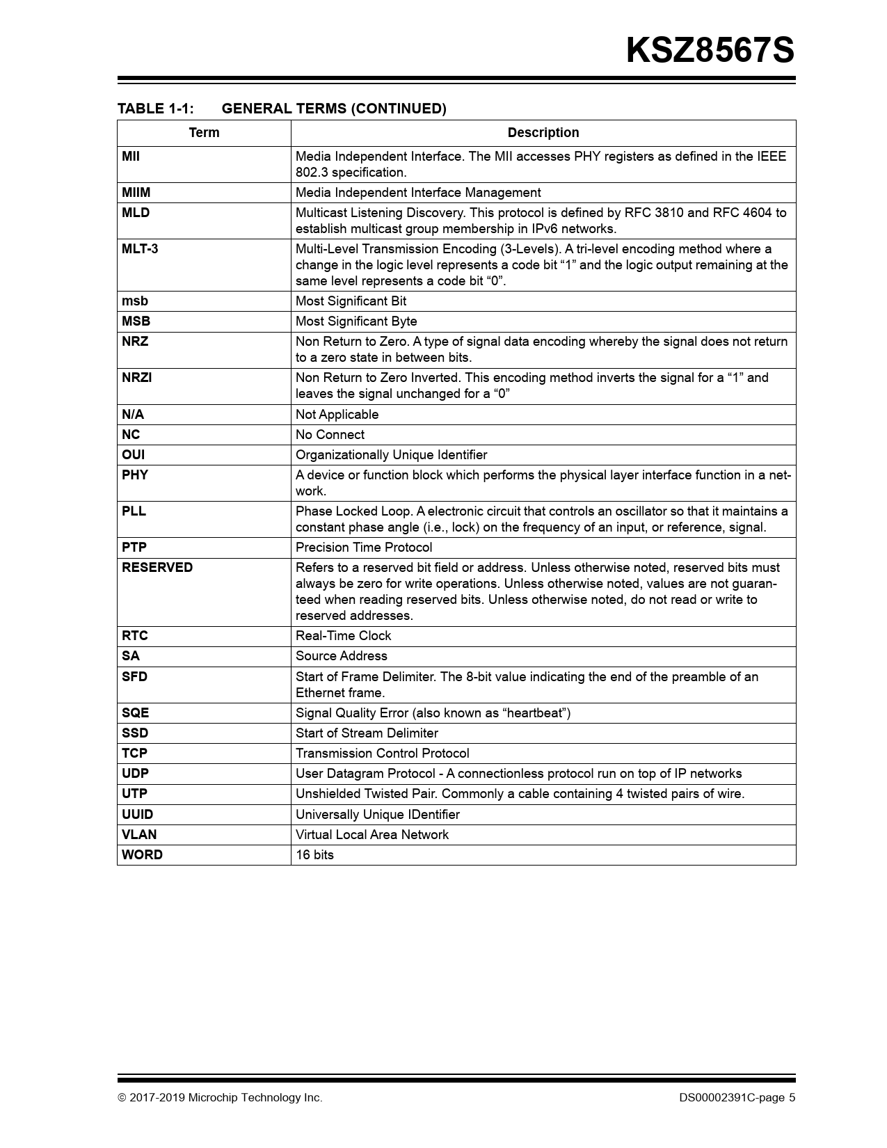 KSZ8567S. TABLE 1-1:. GENERAL TERMS (CONTINUED). Term. Description. MII. MIIM. MLD. MLT-3. msb. MSB. NRZ. NRZI. N/A. OUI. PHY. PLL. PTP. RESERVED. RTC. SFD. SQE