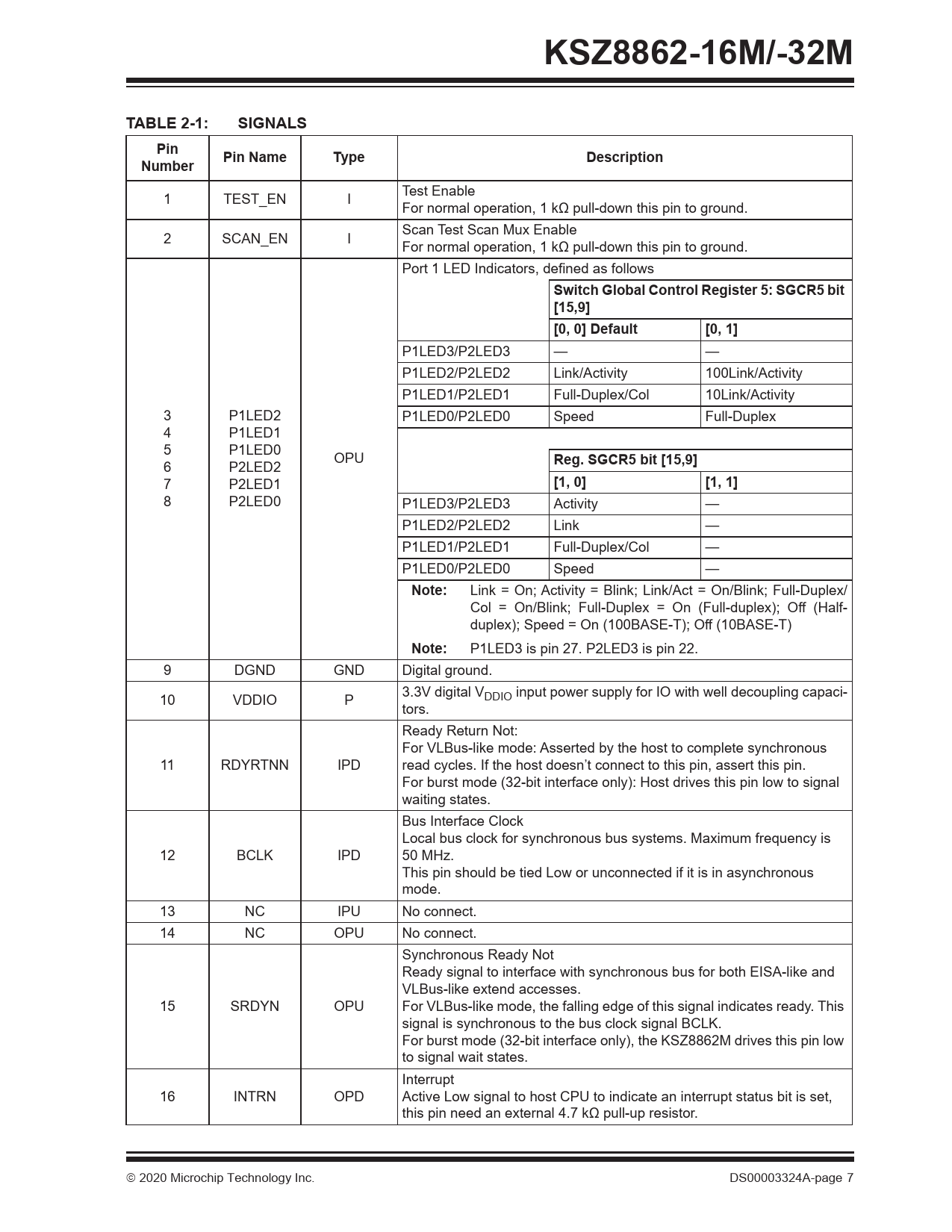 KSZ8862-16M/-32MTABLE 2-1:SIGNALSPinPin NameTypeDescriptionNumber Test Enable 1 TEST_EN I For normal operation, 1 kΩ pull-down this pin to ground. Scan Test Scan Mux Enable 2 SCAN_EN I For normal operation, 1 kΩ pull-down this pin to ground. Port 1 LED Indicators, defined as follows Switch Global Control Register 5: SGCR5 bit [15,9] [0, 0] Default[0, 1] P1LED3/P2LED3 — — P1LED2/P2LED2 Link/Activity 100Link/Activity P1LED1/P2LED1 Full-Duplex/Col 10Link/Activity 3 P1LED2 P1LED0/P2LED0 Speed Full-Duplex 4 P1LED1 5 P1LED0 OPU 6 P2LED2 Reg. SGCR5 bit [15,9] 7 P2LED1 [1, 0][1, 1] 8 P2LED0 P1LED3/P2LED3 Activity — P1LED2/P2LED2 Link — P1LED1/P2LED1 Full-Duplex/Col — P1LED0/P2LED0 Speed — Note: Link = On; Activity = Blink; Link/Act = On/Blink; Full-Duplex/ Col = On/Blink; Full-Duplex = On (Full-duplex); Off (Half- duplex); Speed = On (100BASE-T); Off (10BASE-T) Note: P1LED3 is pin 27. P2LED3 is pin 22. 9 DGND GND Digital ground. 3.3V digital V 10 VDDIO P DDIO input power supply for IO with well decoupling capaci- tors. Ready Return Not: For VLBus-like mode: Asserted by the host to complete synchronous 11 RDYRTNN IPD read cycles. If the host doesn’t connect to this pin, assert this pin. For burst mode (32-bit interface only): Host drives this pin low to signal waiting states. Bus Interface Clock Local bus clock for synchronous bus systems. Maximum frequency is 12 BCLK IPD 50 MHz. This pin should be tied Low or unconnected if it is in asynchronous mode. 13 NC IPU No connect. 14 NC OPU No connect. Synchronous Ready Not Ready signal to interface with synchronous bus for both EISA-like and VLBus-like extend accesses. 15 SRDYN OPU For VLBus-like mode, the falling edge of this signal indicates ready. This signal is synchronous to the bus clock signal BCLK. For burst mode (32-bit interface only), the KSZ8862M drives this pin low to signal wait states. Interrupt 16 INTRN OPD Active Low signal to host CPU to indicate an interrupt status bit is set, this pin need an external 4.7 kΩ pull-up resistor. 2020 Microchip Technology Inc. DS00003324A-page 7 Document Outline 1.0 Introduction 1.1 General Description 2.0 Pin Description and Configuration 3.0 Functional Description 3.1 Functional Overview: Physical Layer Transceiver 3.2 Functional Overview: MAC and Switch 3.3 Bus Interface Unit (BIU) 3.4 Queue Management Unit (QMU) 3.5 Advanced Switch Functions 3.6 IEEE 802.1Q VLAN Support 3.7 QoS Priority Support 3.8 Rate-Limiting Support 3.9 Loopback Support 4.0 Register Descriptions 4.1 CPU Interface I/O Registers 4.2 Register Map: MAC and PHY 4.3 Type-of-Service (TOS) Priority Control Registers 4.4 Management Information Base (MIB) Counters 4.5 Static MAC Address Table 4.6 Dynamic MAC Address Table 4.7 VLAN Table 5.0 Operational Characteristics 5.1 Absolute Maximum Ratings* 5.2 Operating Ratings** 6.0 Electrical Characteristics 7.0 Timing Specifications 7.1 Asynchronous Timing without using Address Strobe (ADSN = 0) 7.2 Asynchronous Timing using Address Strobe (ADSN) 7.3 Asynchronous Timing using DATACSN 7.4 Address Latching Timing for All Modes 7.5 Synchronous Timing in Burst Write (VLBUSN = 1) 7.6 Synchronous Timing in Burst Read (VLBUSN = 1) 7.7 Synchronous Write Timing (VLBUSN = 0) 7.8 Synchronous Read Timing (VLBUSN = 0) 7.9 Auto-Negotiation Timing 7.10 Reset Timing 7.11 EEPROM Timing 8.0 Selection of Isolation Transformers 9.0 Package Outline 9.1 Package Marking Information Appendix A: Data Sheet Revision History The Microchip Website Customer Change Notification Service Customer Support Product Identification System Worldwide Sales and Service
