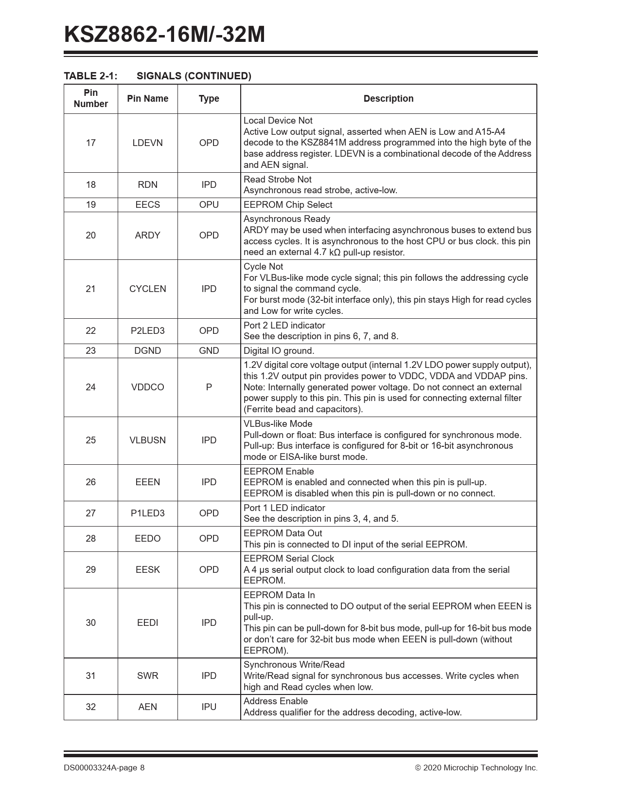 KSZ8862-16M/-32MTABLE 2-1:SIGNALS (CONTINUED)PinPin NameTypeDescriptionNumber Local Device Not Active Low output signal, asserted when AEN is Low and A15-A4 17 LDEVN OPD decode to the KSZ8841M address programmed into the high byte of the base address register. LDEVN is a combinational decode of the Address and AEN signal. Read Strobe Not 18 RDN IPD Asynchronous read strobe, active-low. 19 EECS OPU EEPROM Chip Select Asynchronous Ready ARDY may be used when interfacing asynchronous buses to extend bus 20 ARDY OPD access cycles. It is asynchronous to the host CPU or bus clock. this pin need an external 4.7 kΩ pull-up resistor. Cycle Not For VLBus-like mode cycle signal; this pin follows the addressing cycle 21 CYCLEN IPD to signal the command cycle. For burst mode (32-bit interface only), this pin stays High for read cycles and Low for write cycles. Port 2 LED indicator 22 P2LED3 OPD See the description in pins 6, 7, and 8. 23 DGND GND Digital IO ground. 1.2V digital core voltage output (internal 1.2V LDO power supply output), this 1.2V output pin provides power to VDDC, VDDA and VDDAP pins. 24 VDDCO P Note: Internally generated power voltage. Do not connect an external power supply to this pin. This pin is used for connecting external filter (Ferrite bead and capacitors). VLBus-like Mode Pull-down or float: Bus interface is configured for synchronous mode. 25 VLBUSN IPD Pull-up: Bus interface is configured for 8-bit or 16-bit asynchronous mode or EISA-like burst mode. EEPROM Enable 26 EEEN IPD EEPROM is enabled and connected when this pin is pull-up. EEPROM is disabled when this pin is pull-down or no connect. Port 1 LED indicator 27 P1LED3 OPD See the description in pins 3, 4, and 5. EEPROM Data Out 28 EEDO OPD This pin is connected to DI input of the serial EEPROM. EEPROM Serial Clock 29 EESK OPD A 4 μs serial output clock to load configuration data from the serial EEPROM. EEPROM Data In This pin is connected to DO output of the serial EEPROM when EEEN is pull-up. 30 EEDI IPD This pin can be pull-down for 8-bit bus mode, pull-up for 16-bit bus mode or don’t care for 32-bit bus mode when EEEN is pull-down (without EEPROM). Synchronous Write/Read 31 SWR IPD Write/Read signal for synchronous bus accesses. Write cycles when high and Read cycles when low. Address Enable 32 AEN IPU Address qualifier for the address decoding, active-low. DS00003324A-page 8 2020 Microchip Technology Inc. Document Outline 1.0 Introduction 1.1 General Description 2.0 Pin Description and Configuration 3.0 Functional Description 3.1 Functional Overview: Physical Layer Transceiver 3.2 Functional Overview: MAC and Switch 3.3 Bus Interface Unit (BIU) 3.4 Queue Management Unit (QMU) 3.5 Advanced Switch Functions 3.6 IEEE 802.1Q VLAN Support 3.7 QoS Priority Support 3.8 Rate-Limiting Support 3.9 Loopback Support 4.0 Register Descriptions 4.1 CPU Interface I/O Registers 4.2 Register Map: MAC and PHY 4.3 Type-of-Service (TOS) Priority Control Registers 4.4 Management Information Base (MIB) Counters 4.5 Static MAC Address Table 4.6 Dynamic MAC Address Table 4.7 VLAN Table 5.0 Operational Characteristics 5.1 Absolute Maximum Ratings* 5.2 Operating Ratings** 6.0 Electrical Characteristics 7.0 Timing Specifications 7.1 Asynchronous Timing without using Address Strobe (ADSN = 0) 7.2 Asynchronous Timing using Address Strobe (ADSN) 7.3 Asynchronous Timing using DATACSN 7.4 Address Latching Timing for All Modes 7.5 Synchronous Timing in Burst Write (VLBUSN = 1) 7.6 Synchronous Timing in Burst Read (VLBUSN = 1) 7.7 Synchronous Write Timing (VLBUSN = 0) 7.8 Synchronous Read Timing (VLBUSN = 0) 7.9 Auto-Negotiation Timing 7.10 Reset Timing 7.11 EEPROM Timing 8.0 Selection of Isolation Transformers 9.0 Package Outline 9.1 Package Marking Information Appendix A: Data Sheet Revision History The Microchip Website Customer Change Notification Service Customer Support Product Identification System Worldwide Sales and Service