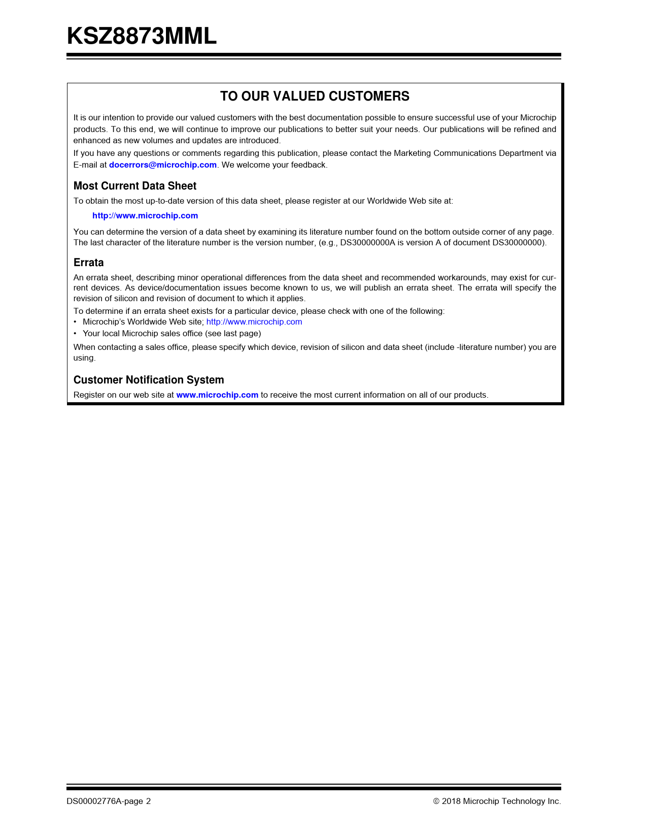 KSZ8873MML. TO OUR VALUED CUSTOMERS. docerrors@microchip.com. Most Current Data Sheet. http://www.microchip.com. Errata