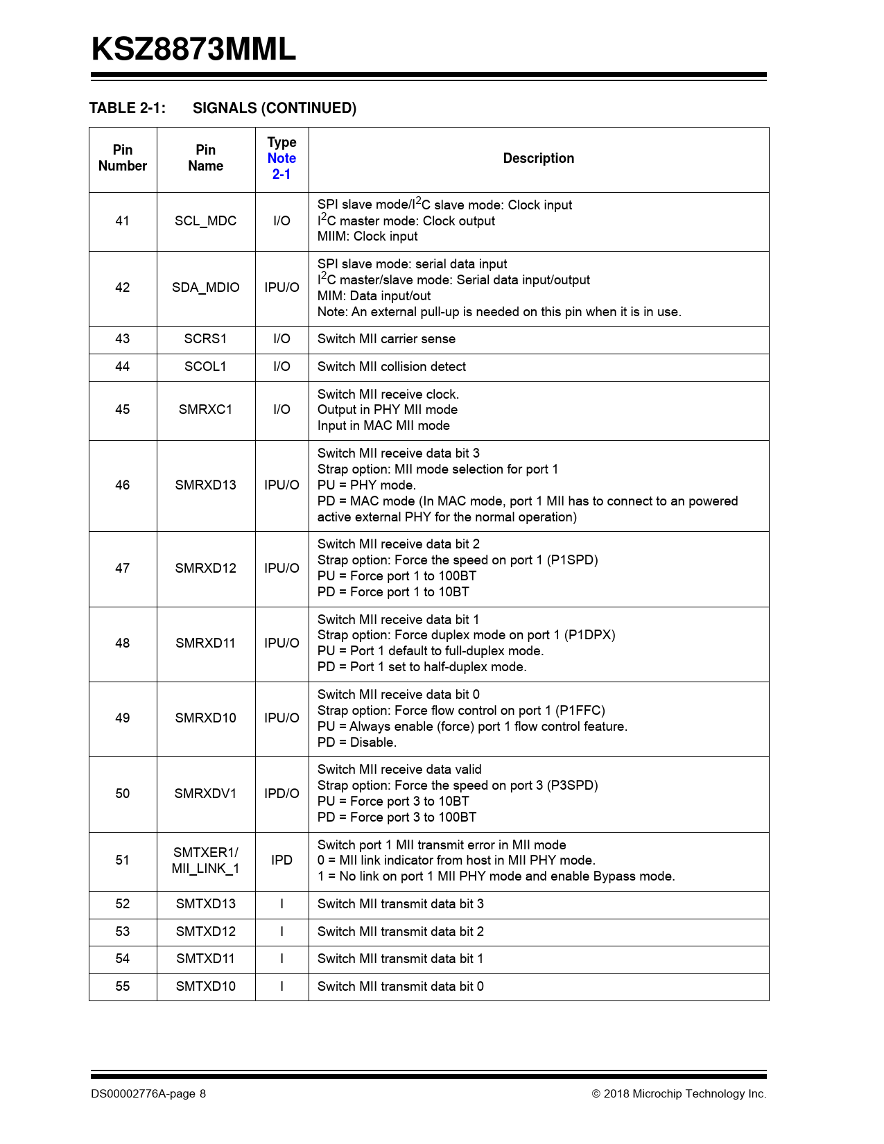 KSZ8873MML. TABLE 2-1:. SIGNALS (CONTINUED). Type. Pin. Note. Description. Number. Name. 2-1