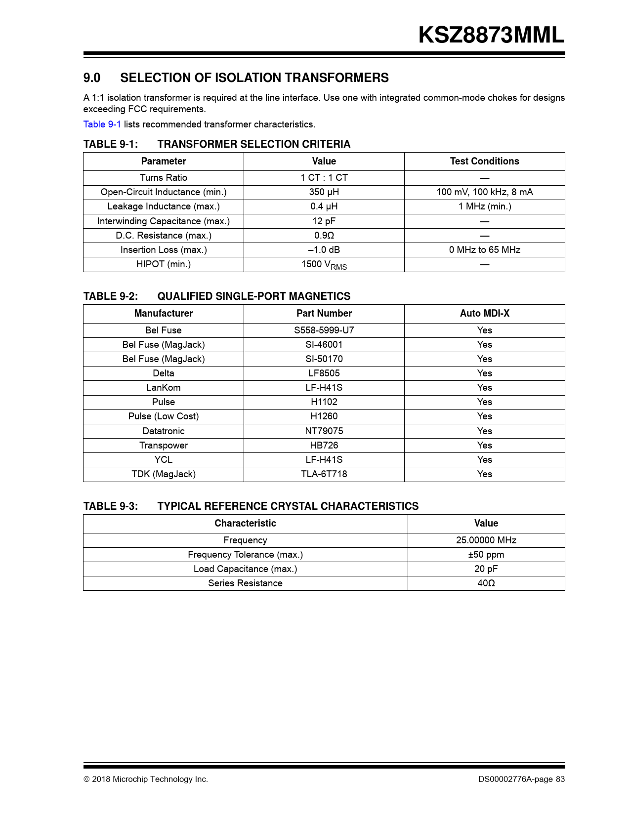 | 页数 / 页 | 91 / 83 — KSZ8873MML. 9.0. SELECTION OF ISOLATION TRANSFORMERS. TABLE 9-1:. … |