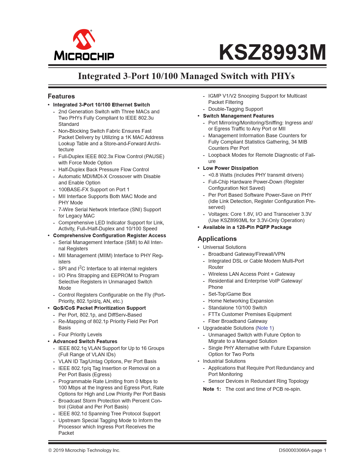 link to page 1 KSZ8993MIntegrated 3-Port 10/100 Managed Switch with PHYsFeatures - IGMP V1/V2 Snooping Support for Multicast • Integrated 3-Port 10/100 Ethernet Switch Packet Filtering - 2nd Generation Switch with Three MACs and - Double-Tagging Support Two PHYs Fully Compliant to IEEE 802.3u • Switch Management Features Standard - Port Mirroring/Monitoring/Sniffing: Ingress and/ - Non-Blocking Switch Fabric Ensures Fast or Egress Traffic to Any Port or MII Packet Delivery by Utilizing a 1K MAC Address - Management Information Base Counters for Lookup Table and a Store-and-Forward Archi- Fully Compliant Statistics Gathering, 34 MIB tecture Counters Per Port - Full-Duplex IEEE 802.3x Flow Control (PAUSE) - Loopback Modes for Remote Diagnostic of Fail- with Force Mode Option ure - Half-Duplex Back Pressure Flow Control • Low Power Dissipation - Automatic MDI/MDI-X Crossover with Disable - <0.8 Watts (includes PHY transmit drivers) and Enable Option - Full-Chip Hardware Power-Down (Register - 100BASE-FX Support on Port 1 Configuration Not Saved) - MII Interface Supports Both MAC Mode and - Per Port Based Software Power-Save on PHY PHY Mode (Idle Link Detection, Register Configuration Pre- - 7-Wire Serial Network Interface (SNI) Support served) for Legacy MAC - Voltages: Core 1.8V, I/O and Transceiver 3.3V - Comprehensive LED Indicator Support for Link, (Use KSZ8993ML for 3.3V-Only Operation) Activity, Full-/Half-Duplex and 10/100 Speed • Available in a 128-Pin PQFP Package• Comprehensive Configuration Register AccessApplications - Serial Management Interface (SMI) to All Inter- nal Registers • Universal Solutions - MII Management (MIIM) Interface to PHY Reg- - Broadband Gateway/Firewall/VPN isters - Integrated DSL or Cable Modem Multi-Port - SPI and I2C Interface to all internal registers Router - I/O Pins Strapping and EEPROM to Program - Wireless LAN Access Point + Gateway Selective Registers in Unmanaged Switch - Residential and Enterprise VoIP Gateway/ Mode Phone - Control Registers Configurable on the Fly (Port- - Set-Top/Game Box Priority, 802.1p/d/q, AN, etc.) - Home Networking Expansion • QoS/CoS Packet Prioritization Support - Standalone 10/100 Switch - Per Port, 802.1p, and DiffServ-Based - FTTx Customer Premises Equipment - Re-Mapping of 802.1p Priority Field Per Port - Fiber Broadband Gateway Basis • Upgradeable Solutions (Note 1) - Four Priority Levels - Unmanaged Switch with Future Option to • Advanced Switch Features Migrate to a Managed Solution - IEEE 802.1q VLAN Support for Up to 16 Groups - Single PHY Alternative with Future Expansion (Full Range of VLAN IDs) Option for Two Ports - VLAN ID Tag/Untag Options, Per Port Basis • Industrial Solutions - IEEE 802.1p/q Tag Insertion or Removal on a - Applications that Require Port Redundancy and Per Port Basis (Egress) Port Monitoring - Programmable Rate Limiting from 0 Mbps to - Sensor Devices in Redundant Ring Topology 100 Mbps at the Ingress and Egress Port, Rate Note 1: The cost and time of PCB re-spin. Options for High and Low Priority Per Port Basis - Broadcast Storm Protection with Percent Con- trol (Global and Per Port Basis) - IEEE 802.1d Spanning Tree Protocol Support - Upstream Special Tagging Mode to Inform the Processor which Ingress Port Receives the Packet 2019 Microchip Technology Inc. DS00003066A-page 1 Document Outline 1.0 Introduction 1.1 General Description 2.0 Pin Description and Configuration 3.0 Functional Description 3.1 Physical Layer Transceiver 3.2 MAC and Switch 3.3 Advanced Switch Functions 3.4 Configuration Interface 3.5 Loopback Support 4.0 Register Descriptions 4.1 MII Management (MIIM) Registers 4.2 Register Descriptions 4.3 Register Map: Switch and PHY (8-bit registers) 4.4 Register Descriptions 4.5 Advanced Control Registers (Registers 96-127) 4.6 Static MAC Address Table 4.7 VLAN Table 4.8 Dynamic MAC Address Table 4.9 Management Information Base (MIB) Counters 5.0 Operational Characteristics 5.1 Absolute Maximum Ratings* 5.2 Operating Ratings** 6.0 Electrical Characteristics 7.0 Timing Specifications 7.1 EEPROM Timing 7.2 SNI Timing 7.3 MAC Mode MII Timing 7.4 PHY Mode MII Timing 7.5 SPI Timing 7.6 Reset Timing 8.0 Reset Circuit 9.0 Selection of Isolation Transformers 10.0 Package Outline 10.1 Package Marking Information Appendix A: Data Sheet Revision History The Microchip Website Customer Change Notification Service Customer Support Product Identification System Worldwide Sales and Service