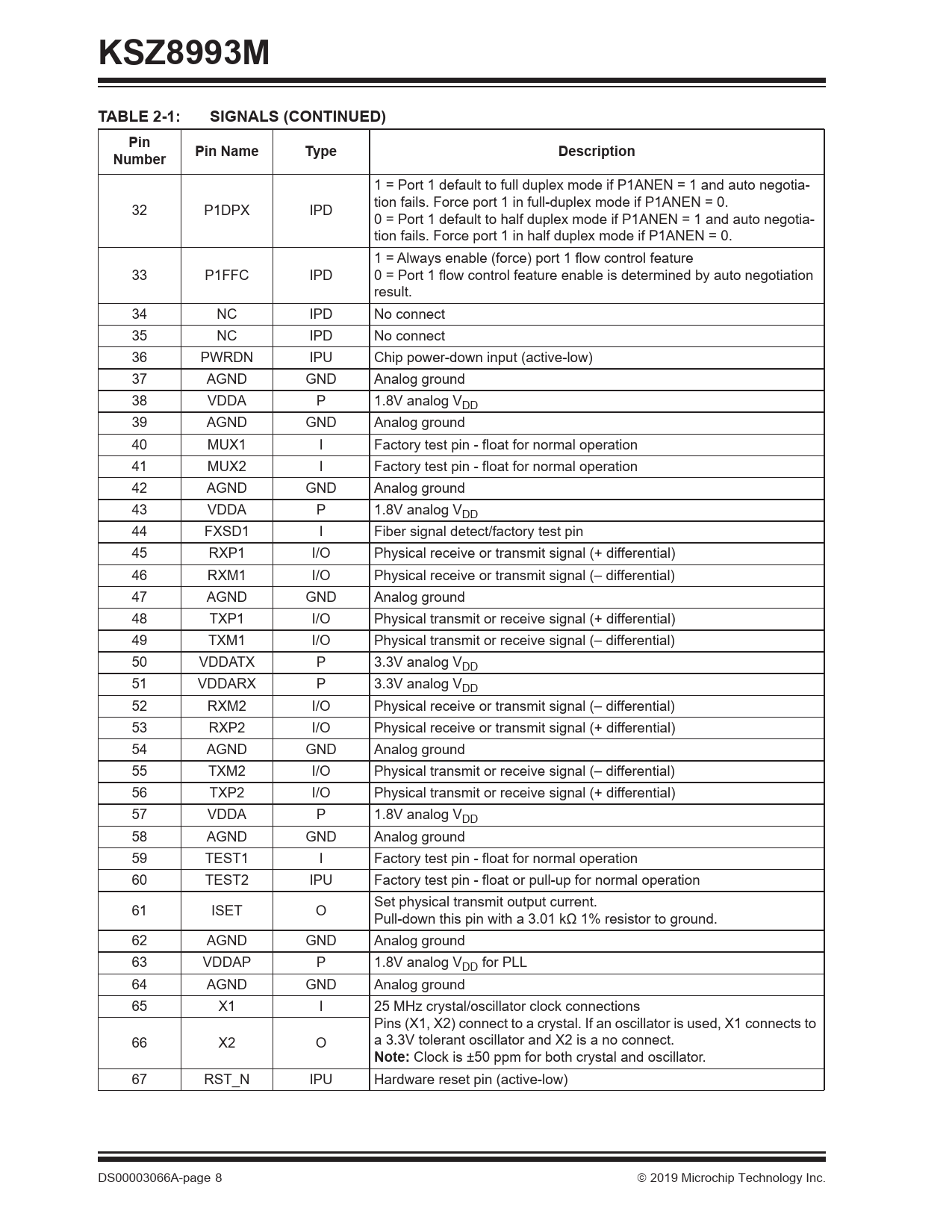 KSZ8993MTABLE 2-1:SIGNALS (CONTINUED)PinPin NameTypeDescriptionNumber 1 = Port 1 default to full duplex mode if P1ANEN = 1 and auto negotia- tion fails. Force port 1 in full-duplex mode if P1ANEN = 0. 32 P1DPX IPD 0 = Port 1 default to half duplex mode if P1ANEN = 1 and auto negotia- tion fails. Force port 1 in half duplex mode if P1ANEN = 0. 1 = Always enable (force) port 1 flow control feature 33 P1FFC IPD 0 = Port 1 flow control feature enable is determined by auto negotiation result. 34 NC IPD No connect 35 NC IPD No connect 36 PWRDN IPU Chip power-down input (active-low) 37 AGND GND Analog ground 38 VDDA P 1.8V analog VDD 39 AGND GND Analog ground 40 MUX1 I Factory test pin - float for normal operation 41 MUX2 I Factory test pin - float for normal operation 42 AGND GND Analog ground 43 VDDA P 1.8V analog VDD 44 FXSD1 I Fiber signal detect/factory test pin 45 RXP1 I/O Physical receive or transmit signal (+ differential) 46 RXM1 I/O Physical receive or transmit signal (– differential) 47 AGND GND Analog ground 48 TXP1 I/O Physical transmit or receive signal (+ differential) 49 TXM1 I/O Physical transmit or receive signal (– differential) 50 VDDATX P 3.3V analog VDD 51 VDDARX P 3.3V analog VDD 52 RXM2 I/O Physical receive or transmit signal (– differential) 53 RXP2 I/O Physical receive or transmit signal (+ differential) 54 AGND GND Analog ground 55 TXM2 I/O Physical transmit or receive signal (– differential) 56 TXP2 I/O Physical transmit or receive signal (+ differential) 57 VDDA P 1.8V analog VDD 58 AGND GND Analog ground 59 TEST1 I Factory test pin - float for normal operation 60 TEST2 IPU Factory test pin - float or pull-up for normal operation Set physical transmit output current. 61 ISET O Pull-down this pin with a 3.01 kΩ 1% resistor to ground. 62 AGND GND Analog ground 63 VDDAP P 1.8V analog VDD for PLL 64 AGND GND Analog ground 65 X1 I 25 MHz crystal/oscillator clock connections Pins (X1, X2) connect to a crystal. If an oscillator is used, X1 connects to 66 X2 O a 3.3V tolerant oscillator and X2 is a no connect. Note: Clock is ±50 ppm for both crystal and oscillator. 67 RST_N IPU Hardware reset pin (active-low) DS00003066A-page 8 2019 Microchip Technology Inc. Document Outline 1.0 Introduction 1.1 General Description 2.0 Pin Description and Configuration 3.0 Functional Description 3.1 Physical Layer Transceiver 3.2 MAC and Switch 3.3 Advanced Switch Functions 3.4 Configuration Interface 3.5 Loopback Support 4.0 Register Descriptions 4.1 MII Management (MIIM) Registers 4.2 Register Descriptions 4.3 Register Map: Switch and PHY (8-bit registers) 4.4 Register Descriptions 4.5 Advanced Control Registers (Registers 96-127) 4.6 Static MAC Address Table 4.7 VLAN Table 4.8 Dynamic MAC Address Table 4.9 Management Information Base (MIB) Counters 5.0 Operational Characteristics 5.1 Absolute Maximum Ratings* 5.2 Operating Ratings** 6.0 Electrical Characteristics 7.0 Timing Specifications 7.1 EEPROM Timing 7.2 SNI Timing 7.3 MAC Mode MII Timing 7.4 PHY Mode MII Timing 7.5 SPI Timing 7.6 Reset Timing 8.0 Reset Circuit 9.0 Selection of Isolation Transformers 10.0 Package Outline 10.1 Package Marking Information Appendix A: Data Sheet Revision History The Microchip Website Customer Change Notification Service Customer Support Product Identification System Worldwide Sales and Service