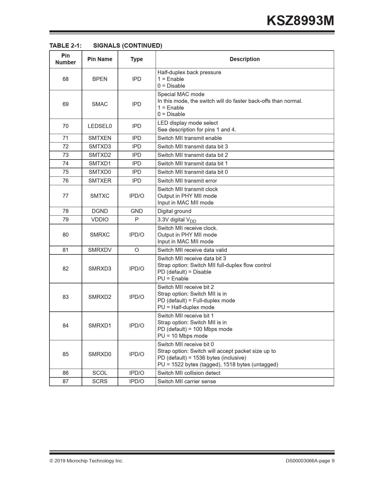 页数 / 页74 / 9 — KSZ8993M. TABLE 2-1:. SIGNALS (CONTINUED). Pin. Pin Name. Type. …