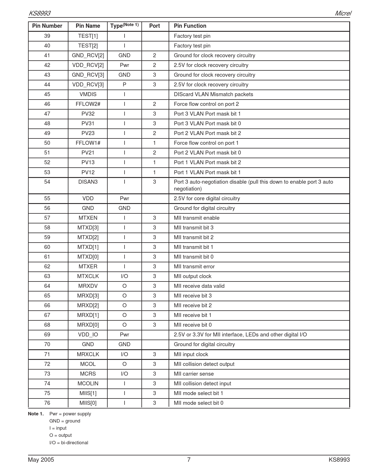 Pwr = power supply GND = ground I = input O = output I/O = bi-directional May 2005 7 KS8993