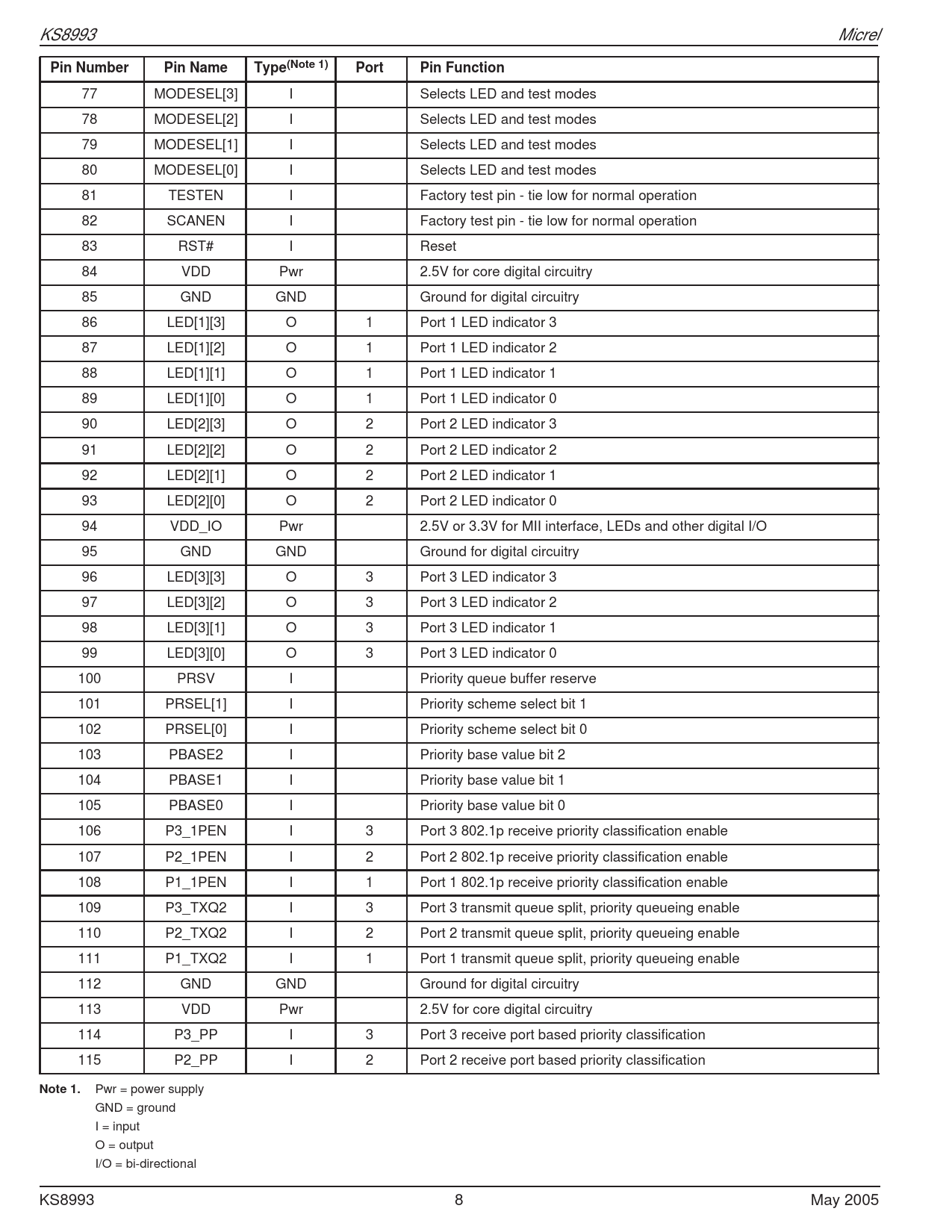 Pwr = power supply GND = ground I = input O = output I/O = bi-directional KS8993 8 May 2005