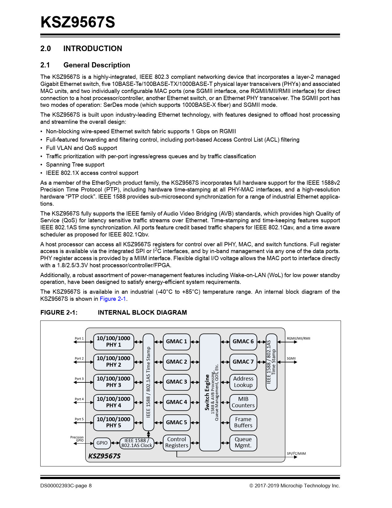 link to page 8 KSZ9567S2.0INTRODUCTION2.1General Description The KSZ9567S is a highly-integrated, IEEE 802.3 compliant networking device that incorporates a layer-2 managed Gigabit Ethernet switch, five 10BASE-Te/100BASE-TX/1000BASE-T physical layer transceivers (PHYs) and associated MAC units, and two individually configurable MAC ports (one SGMII interface, one RGMII/MII/RMII interface) for direct connection to a host processor/controller, another Ethernet switch, or an Ethernet PHY transceiver. The SGMII port has two modes of operation: SerDes mode (which supports 1000BASE-X fiber) and SGMII mode. The KSZ9567S is built upon industry-leading Ethernet technology, with features designed to offload host processing and streamline the overall design: • Non-blocking wire-speed Ethernet switch fabric supports 1 Gbps on RGMII • Full-featured forwarding and filtering control, including port-based Access Control List (ACL) filtering • Full VLAN and QoS support • Traffic prioritization with per-port ingress/egress queues and by traffic classification • Spanning Tree support • IEEE 802.1X access control support As a member of the EtherSynch product family, the KSZ9567S incorporates full hardware support for the IEEE 1588v2 Precision Time Protocol (PTP), including hardware time-stamping at all PHY-MAC interfaces, and a high-resolution hardware “PTP clock”. IEEE 1588 provides sub-microsecond synchronization for a range of industrial Ethernet applica- tions. The KSZ9567S fully supports the IEEE family of Audio Video Bridging (AVB) standards, which provides high Quality of Service (QoS) for latency sensitive traffic streams over Ethernet. Time-stamping and time-keeping features support IEEE 802.1AS time synchronization. All ports feature credit based traffic shapers for IEEE 802.1Qav, and a time aware scheduler as proposed for IEEE 802.1Qbv. A host processor can access all KSZ9567S registers for control over all PHY, MAC, and switch functions. Full register access is available via the integrated SPI or I2C interfaces, and by in-band management via any one of the data ports. PHY register access is provided by a MIIM interface. Flexible digital I/O voltage allows the MAC port to interface directly with a 1.8/2.5/3.3V host processor/controller/FPGA. Additionally, a robust assortment of power-management features including Wake-on-LAN (WoL) for low power standby operation, have been designed to satisfy energy-efficient system requirements. The KSZ9567S is available in an industrial (-40°C to +85°C) temperature range. An internal block diagram of the KSZ9567S is shown in Figure 2-1. FIGURE 2-1:INTERNAL BLOCK DIAGRAM Port 1 10/100/1000 RGMII/MII/RMII S PHY 1GMAC 1GMAC 6 A p .1 p am Port 2 10/100/1000 am SGMII / 802 PHY 2 e St GMAC 2 . GMAC 7 St m 88 e , S Ti e g S, Etc E 15 Tim Port 3 10/100/1000GMAC 3 ssin Address , QO PHY 3 2.1A gin ce IEE o nt Lookup e En PrB me / 80 g Port 4 10/100/1000chGMAC 4it AV MIB PHY 4 & ana Counters Sw 588 e M EE 1588 1 ue IE Port 5 10/100/1000GMAC 5 Qu Frame PHY 5 Buffers Precision GPIO IEEE 1588 / Control Queue GPIO 802.1AS Clock Registers Mgmt. KSZ9567S SPI/I2C/MIIM DS00002393C-page 8 2017-2019 Microchip Technology Inc. Document Outline 1.0 Preface 1.1 Glossary of Terms TABLE 1-1: General Terms 1.2 Buffer Types TABLE 1-2: Buffer Types 1.3 Register Nomenclature TABLE 1-3: Register Nomenclature 1.4 References 2.0 Introduction 2.1 General Description FIGURE 2-1: Internal Block Diagram 3.0 Pin Descriptions and Configuration 3.1 Pin Assignments FIGURE 3-1: Pin Assignments (Top View) TABLE 3-1: Pin Assignments 3.2 Pin Descriptions TABLE 3-2: Pin Descriptions 3.2.1 Configuration Straps TABLE 3-3: Configuration Strap Descriptions 4.0 Functional Description 4.1 Physical Layer Transceiver (PHY) 4.1.1 1000BASE-T Transceiver 4.1.2 100BASE-TX Transceiver 4.1.3 10BASE-Te Transceiver 4.1.4 Auto MDI/MDI-X TABLE 4-1: MDI/MDI-X Pin Definitions 4.1.5 Pair-Swap, Alignment, and Polarity Check 4.1.6 Wave Shaping, Slew-Rate Control, and Partial Response 4.1.7 Auto-Negotiation FIGURE 4-1: Auto-Negotiation and Parallel Operation 4.1.8 Fast Link-Up 4.1.9 LinkMD® Cable Diagnostics 4.1.10 Remote PHY Loopback FIGURE 4-2: Remote PHY Loopback 4.2 LEDs 4.2.1 Single-LED Mode TABLE 4-2: Single-LED Mode Pin Definition 4.2.2 Tri-Color Dual-LED Mode TABLE 4-3: Tri-Color Dual-LED Mode Pin Definition 4.3 Media Access Controller (MAC) 4.3.1 MAC Operation 4.3.2 Inter-Packet Gap (IPG) 4.3.3 Back-Off Algorithm 4.3.4 Late Collision 4.3.5 Legal Packet Size 4.3.6 Flow Control 4.3.7 Half-Duplex Back Pressure 4.3.8 Flow Control and Back Pressure Registers TABLE 4-4: Flow Control and back Pressure Registers 4.3.9 Broadcast Storm Protection 4.3.10 Self-Address Filtering 4.4 Switch 4.4.1 Switching Engine 4.4.2 Address Lookup TABLE 4-5: Address Lookup Table Hashing Options TABLE 4-6: Reserved Multicast Address Table FIGURE 4-3: Packet Forwarding Process Flowchart TABLE 4-7: Lookup Engine Registers 4.4.3 IEEE 802.1Q VLAN TABLE 4-8: VLAN Forwarding TABLE 4-9: Hashed(DA) + FID Lookup in VLAN Mode TABLE 4-10: Hashed(SA) + FID Lookup in VLAN Mode TABLE 4-11: VLAN Registers 4.4.4 Quality-of-Service (QoS) Priority Support FIGURE 4-4: 802.p Priority Field Format 4.4.5 Traffic Conditioning & Policing 4.4.6 Spanning Tree Support TABLE 4-12: Spanning Tree States 4.4.7 Rapid Spanning Tree Support 4.4.8 Multiple Spanning Tree Support 4.4.9 Tail Tagging Mode FIGURE 4-5: Tail Tag Frame Format TABLE 4-13: Receive Tail Tag Format (from Switch to Host) TABLE 4-14: Transmit Tail Tag Format (from Host to Switch) FIGURE 4-6: PTP Mode Tail Tag Frame Format 4.4.10 IGMP Support 4.4.11 IPv6 MLD Snooping 4.4.12 Port Mirroring 4.4.13 Scheduling and Rate Limiting 4.4.14 Egress Traffic Shaping 4.4.15 Low Latency Cut-Through Mode 4.4.16 Ingress MAC Address Filtering Function 4.4.17 802.1X Access Control 4.4.18 Access Control List (ACL) Filtering TABLE 4-15: ACL Processing Entry Parameters FIGURE 4-7: ACL Structure and Example Rule Values 