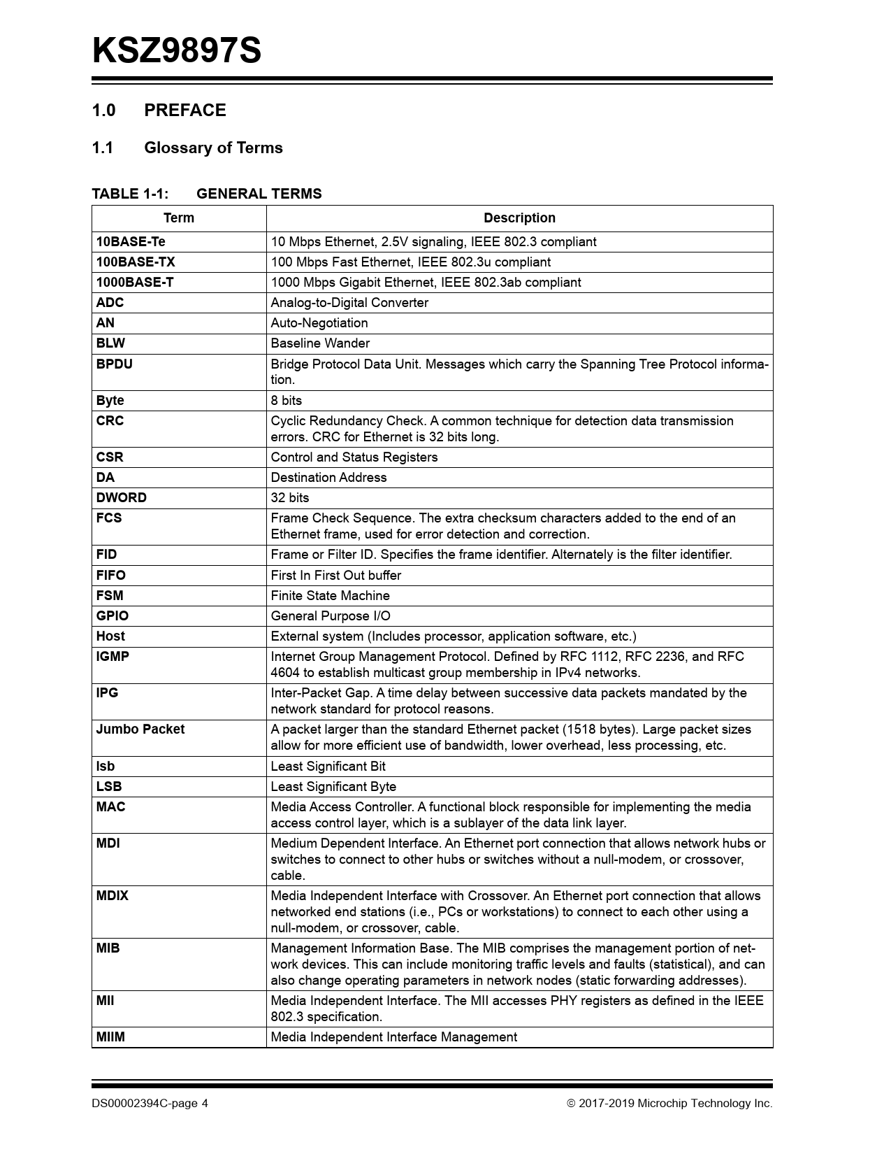 KSZ9897S 1.0 PREFACE 1.1 Glossary of Terms TABLE 1-1: GENERAL TERMS Term Description 10BASE-Te 100BASE-TX 1000BASE-T ADC BLW BPDU Byte