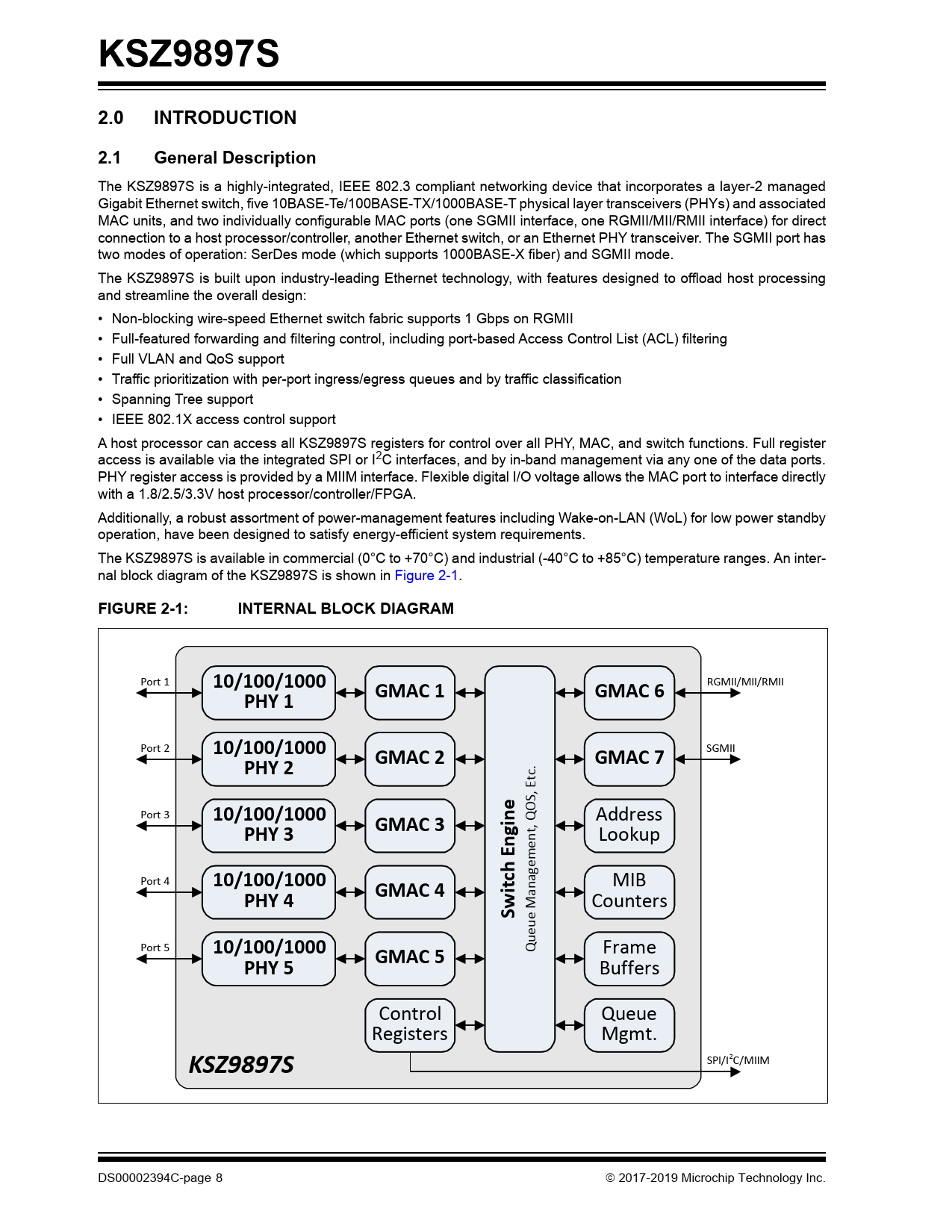 The KSZ9897S is a highly-integrated, IEEE 802.3 compliant networking device that incorporates a layer-2 managed Gigabit Ethernet switch, five 10BASE-Te/100BASE-TX/1000BASE-T physical layer transceivers (PHYs) and associated MAC units, and two individually configurable MAC ports (one SGMII interface, one RGMII/MII/RMII interface) for direct connection to a host processor/controller, another Ethernet switch, or an Ethernet PHY transceiver. The SGMII port has two modes of operation: SerDes mode (which supports 1000BASE-X fiber) and SGMII mode. The KSZ9897S is built upon industry-leading Ethernet technology, with features designed to offload host processing and streamline the overall design: • Non-blocking wire-speed Ethernet switch fabric supports 1 Gbps on RGMII • Full-featured forwarding and filtering control, including port-based Access Control List (ACL) filtering • Full VLAN and QoS support • Traffic prioritization with per-port ingress/egress queues and by traffic classification • Spanning Tree support • IEEE 802.1X access control support A host processor can access all KSZ9897S registers for control over all PHY, MAC, and switch functions. Full register access is available via the integrated SPI or I2C interfaces, and by in-band management via any one of the data ports. PHY register access is provided by a MIIM interface. Flexible digital I/O voltage allows the MAC port to interface directly with a 1.8/2.5/3.3V host processor/controller/FPGA. Additionally, a robust assortment of power-management features including Wake-on-LAN (WoL) for low power standby operation, have been designed to satisfy energy-efficient system requirements. The KSZ9897S is available in commercial (0°C to +70°C) and industrial (-40°C to +85°C) temperature ranges. An inter- nal block diagram of the KSZ9897S is shown in Figure 2-1.