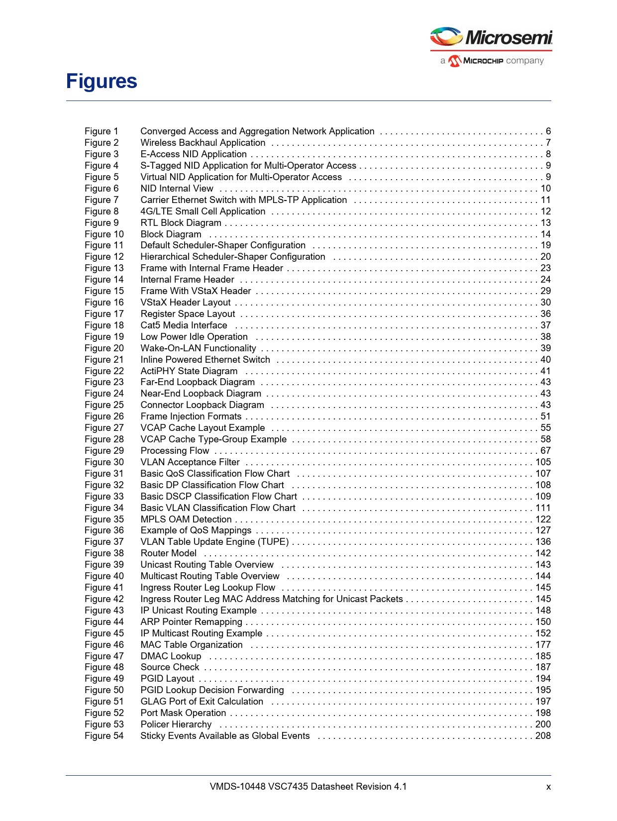 Figure 1 Converged Access and Aggregation Network Application . 6 Figure 2 Wireless Backhaul Application . 7 Figure 3 E-Access NID Application . 8 Figure 4 S-Tagged NID Application for Multi-Operator Access . 9 Figure 5 Virtual NID Application for Multi-Operator Access . 9 Figure 6 NID Internal View . 10 Figure 7 Carrier Ethernet Switch with MPLS-TP Application . 11 Figure 8 4G/LTE Small Cell Application . 12 Figure 9 RTL Block Diagram . 13 Figure 10 Block Diagram . 14 Figure 11 Default Scheduler-Shaper Configuration . 19 Figure 12 Hierarchical Scheduler-Shaper Configuration . 20 Figure 13 Frame with Internal Frame Header . 23 Figure 14 Internal Frame Header . 24 Figure 15 Frame With VStaX Header . 29 Figure 16 VStaX Header Layout . 30 Figure 17 Register Space Layout . 36 Figure 18 Cat5 Media Interface . 37 Figure 19 Low Power Idle Operation . 38 Figure 20 Wake-On-LAN Functionality . 39 Figure 21 Inline Powered Ethernet Switch . 40 Figure 22 ActiPHY State Diagram . 41 Figure 23 Far-End Loopback Diagram . 43 Figure 24 Near-End Loopback Diagram . 43 Figure 25 Connector Loopback Diagram . 43 Figure 26 Frame Injection Formats . 51 Figure 27 VCAP Cache Layout Example . 55 Figure 28 VCAP Cache Type-Group Example . 58 Figure 29 Processing Flow . 67 Figure 30 VLAN Acceptance Filter . 105 Figure 31 Basic QoS Classification Flow Chart . 107 Figure 32 Basic DP Classification Flow Chart . 108 Figure 33 Basic DSCP Classification Flow Chart . 109 Figure 34 Basic VLAN Classification Flow Chart . 111 Figure 35 MPLS OAM Detection . 122 Figure 36 Example of QoS Mappings . 127 Figure 37 VLAN Table Update Engine (TUPE) . 136 Figure 38 Router Model . 142 Figure 39 Unicast Routing Table Overview . 143 Figure 40 Multicast Routing Table Overview . 144 Figure 41 Ingress Router Leg Lookup Flow . 145 Figure 42 Ingress Router Leg MAC Address Matching for Unicast Packets . 145 Figure 43 IP Unicast Routing Example . 148 Figure 44 ARP Pointer Remapping . 150 Figure 45 IP Multicast Routing Example . 152 Figure 46 MAC Table Organization . 177 Figure 47 DMAC Lookup . 185 Figure 48 Source Check . 187 Figure 49 PGID Layout . 194 Figure 50 PGID Lookup Decision Forwarding . 195 Figure 51 GLAG Port of Exit Calculation . 197 Figure 52 Port Mask Operation . 198 Figure 53 Policer Hierarchy . 200 Figure 54 Sticky Events Available as Global Events . 208 VMDS-10448 VSC7435 Datasheet Revision 4.1 x Document Outline 1 Revision History 1.1 Revision 4.1 1.2 Revision 4.0 2 Product Overview 2.1 General Features 2.1.1 Layer 2 and Layer 3 Forwarding 2.1.2 Carrier Ethernet Support 2.1.3 Timing and Synchronization 2.1.4 Quality of Service 2.1.5 Security 2.1.6 Management 2.1.7 Product Parameters 2.2 Applications 2.2.1 Wireless Backhaul 2.2.2 Network Interface Device (NID) 2.2.3 Carrier Ethernet Switch with MPLS-TP 2.2.4 Small Cell Application 3 Functional Descriptions 3.1 Register Notations 3.2 Functional Overview 3.2.1 Frame Arrival in Ports and Port Modules 3.2.2 Basic Classification 3.2.3 Virtualized Service Aware Architecture (ViSAA™) 3.2.4 Security and Control Protocol Classification 3.2.5 Policing 3.2.6 Layer 2 Forwarding 3.2.7 Layer 3 Forwarding 3.2.8 Shared Queue System and Hierarchical Scheduler 3.2.9 Rewriter and Frame Departure 3.2.10 CPU Port Module 3.2.11 Synchronous Ethernet and Precision Time Protocol (PTP) 3.2.12 Ethernet and MPLS OAM 3.2.13 CPU Subsystem 3.3 Frame Headers 3.3.1 Internal Frame Header Placement 3.3.2 Internal Frame Header Layout 3.3.3 VStaX Header 3.4 Port Numbering and Mappings 3.4.1 Supported SerDes Interfaces 3.4.2 Dual-Media Mode 3.4.3 Logical Port Numbers 3.5 SERDES1G 3.6 SERDES6G 3.7 Copper Transceivers 3.7.1 Register Access 3.7.2 Cat5 Twisted Pair Media Interface 3.7.3 Wake-On-LAN and SecureOn 3.7.4 Ethernet Inline Powered Devices 3.7.5 IEEE 802.3af PoE Support 3.7.6 ActiPHY™ Power Management 3.7.7 Testing Features 3.7.8 VeriPHY™ Cable Diagnostics 3.8 DEV1G and DEV2G5 Port Modules 3.8.1 MAC 3.8.2 Half-Duplex Mode 3.8.3 Physical Coding Sublayer (PCS) 3.8.4 Port Statistics 3.9 Assembler 3.9.1 Setting Up a Port in the Assembler 3.9.2 Setting Up a Port for Frame Injection 3.9.3 Setting Up MAC Control Sublayer PAUSE Frame Detection 3.9.4 Setting Up PFC 3.9.5 Setting Up Assembler Port Statistics 3.9.6 Setting Up the Loopback Path 3.10 Versatile Content-Aware Processor (VCAP) 3.10.1 Configuring VCAP 3.10.2 Wide VCAP Entries and Actions 3.10.3 Individual VCAPs 3.10.4 VCAP Programming Examples 3.11 Pipeline Points 3.11.1 Pipeline Definitions 3.12 Analyzer 3.12.1 Initializing the Analyzer 3.13 VCAP CLM Keys and Actions 3.13.1 Keys Overview 3.13.2 VCAP CLM X1 Key Details 3.13.3 VCAP CLM X2 Key Details 3.13.4 VCAP CLM X4 Key Details 3.13.5 VCAP CLM X8 Key Details 3.13.6 VCAP CLM X16 Key Details 3.13.7 VCAP CLM Actions 3.14 Analyzer Classifier 3.14.1 Basic Classifier 3.14.2 VCAP CLM Processing 3.14.3 QoS Mapping Table 3.14.4 Ingress Protection Table (IPT) 3.14.5 Layer 2 Control Protocol Processing 3.14.6 Y.1731 Ethernet MIP 3.14.7 Analyzer Classifier Diagnostics 3.15 VLAN and MSTP 3.15.1 Private VLAN 3.15.2 VLAN Pseudo Code 3.16 VCAP LPM: Keys and Action 3.16.1 VCAP LPM SGL_IP4 Key Details 3.16.2 VCAP LPM DBL_IP4 Key Details 3.16.3 VCAP LPM SGL_IP6 Key Details 3.16.4 VCAP LPM DBL_IP6 Key Details 3.16.5 VCAP LPM Actions 3.17 IP Processing 3.17.1 IP Source/Destination Guard 3.17.2 IP Routing 3.17.3 Statistics 3.17.4 IGMP/MLD Snooping Switch 3.18 VCAP IS2 Keys and Actions 3.18.1 VCAP IS2 Keys 3.18.2 VCAP IS2 Actions 3.19 Analyzer Access Control Lists 3.19.1 VCAP IS2 3.19.2 Analyzer Access Control List Frame Rewriting 3.20 Analyzer Layer 2 Forwarding and Learning 3.20.1 Analyzer MAC Table 3.20.2 MAC Table Updates 3.20.3 CPU Access to MAC Table 3.20.4 SCAN Command 3.20.5 Forwarding Lookups 3.20.6 Source Check and Automated Learning 3.20.7 Automated Aging (AUTOAGE) 3.20.8 Service Handling 3.20.9 Interrupt Handling 3.21 Analyzer Access Control Forwarding, Policing, and Statistics 3.21.1 Mask Handling 3.21.2 Policing 3