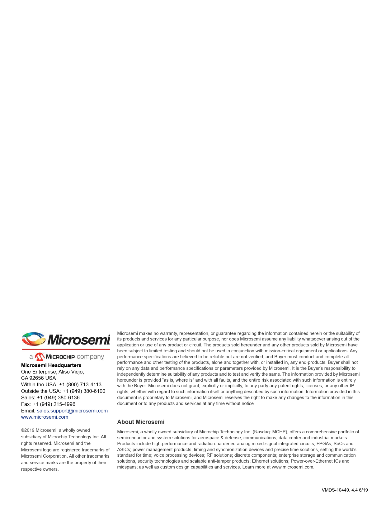 performance and other testing of the products, alone and together with, or installed in, any end-products. Buyer shall not rely on any data and performance specifications or parameters provided by Microsemi. It is the Buyer’s responsibility to One Enterprise, Aliso Viejo, independently determine suitability of any products and to test and verify the same. The information provided by Microsemi CA 92656 USA hereunder is provided “as is, where is” and with all faults, and the entire risk associated with such information is entirely Within the USA: +1 (800) 713-4113 with the Buyer. Microsemi does not grant, explicitly or implicitly, to any party any patent rights, licenses, or any other IP Outside the USA: +1 (949) 380-6100 rights, whether with regard to such information itself or anything described by such information. Information provided in this Sales: +1 (949) 380-6136 document is proprietary to Microsemi, and Microsemi reserves the right to make any changes to the information in this Fax: +1 (949) 215-4996 document or to any products and services at any time without notice. Email: sales.support@microsemi.com www.microsemi.com