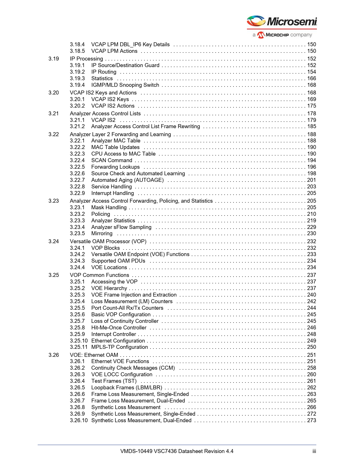 该数据表的模型线 文件文字版本 link to page 170 link to page 170 link to page 172 link to page 172 link to page 174 link to page 186 link to page 188 link to page 188 link to page 189 link to page 195 link to page 198 link to page 199 link to page 205 link to page 208 link to page 208 link to page 210 link to page 210 link to page 214 link to page 216 link to page 218 link to page 221 link to page 223 link to page 225 link to page 225 link to page 225 link to page 230 link to page 239 link to page 249 link to page 250 link to page 252 link to page 252 link to page 253 link to page 254 link to page 254 link to page 257 link to page 257 link to page 257 link to page 260 link to page 262 link to page 264 link to page 265 link to page 265 link to page 266 link to page 268 link to page 269 link to page 270 link to page 271 link to page 271 link to page 278 link to page 280 link to page 281 link to page 282 link to page 283 link to page 285 link to page 286 link to page 292 link to page 293 3.18.4 VCAP LPM DBL_IP6 Key Details . 150 3.18.5 VCAP LPM Actions . 150 3.19 IP Processing . 152 3.19.1 IP Source/Destination Guard . 152 3.19.2 IP Routing . 154 3.19.3 Statistics . 166 3.19.4 IGMP/MLD Snooping Switch . 168 3.20 VCAP IS2 Keys and Actions . 168 3.20.1 VCAP IS2 Keys . 169 3.20.2 VCAP IS2 Actions . 175 3.21 Analyzer Access Control Lists . 178 3.21.1 VCAP IS2 . 179 3.21.2 Analyzer Access Control List Frame Rewriting . 185 3.22 Analyzer Layer 2 Forwarding and Learning . 188 3.22.1 Analyzer MAC Table . 188 3.22.2 MAC Table Updates . 190 3.22.3 CPU Access to MAC Table . 190 3.22.4 SCAN Command . 194 3.22.5 Forwarding Lookups . 196 3.22.6 Source Check and Automated Learning . 198 3.22.7 Automated Aging (AUTOAGE) . 201 3.22.8 Service Handling . 203 3.22.9 Interrupt Handling . 205 3.23 Analyzer Access Control Forwarding, Policing, and Statistics . 205 3.23.1 Mask Handling . 205 3.23.2 Policing . 210 3.23.3 Analyzer Statistics . 219 3.23.4 Analyzer sFlow Sampling . 229 3.23.5 Mirroring . 230 3.24 Versatile OAM Processor (VOP) . 232 3.24.1 VOP Blocks . 232 3.24.2 Versatile OAM Endpoint (VOE) Functions . 233 3.24.3 Supported OAM PDUs . 234 3.24.4 VOE Locations . 234 3.25 VOP Common Functions . 237 3.25.1 Accessing the VOP . 237 3.25.2 VOE Hierarchy . 237 3.25.3 VOE Frame Injection and Extraction . 240 3.25.4 Loss Measurement (LM) Counters . 242 3.25.5 Port Count-All Rx/Tx Counters . 244 3.25.6 Basic VOP Configuration . 245 3.25.7 Loss of Continuity Controller . 245 3.25.8 Hit-Me-Once Controller . 246 3.25.9 Interrupt Controller . 248 3.25.10 Ethernet Configuration . 249 3.25.11 MPLS-TP Configuration . 250 3.26 VOE: Ethernet OAM . 251 3.26.1 Ethernet VOE Functions . 251 3.26.2 Continuity Check Messages (CCM) . 258 3.26.3 VOE LOCC Configuration . 260 3.26.4 Test Frames (TST) . 261 3.26.5 Loopback Frames (LBM/LBR) . 262 3.26.6 Frame Loss Measurement, Single-Ended . 263 3.26.7 Frame Loss Measurement, Dual-Ended . 265 3.26.8 Synthetic Loss Measurement . 266 3.26.9 Synthetic Loss Measurement, Single-Ended . 272 3.26.10 Synthetic Loss Measurement, Dual-Ended . 273 VMDS-10449 VSC7436 Datasheet Revision 4.4 iii Document Outline 1 Revision History 1.1 Revision 4.4 1.2 Revision 4.3 1.3 Revision 4.2 1.4 Revision 4.1 1.5 Revision 4.0 1.6 Revision 2.0 2 Product Overview 2.1 General Features 2.1.1 Layer 2 and Layer 3 Forwarding 2.1.2 Carrier Ethernet Support 2.1.3 Timing and Synchronization 2.1.4 Quality of Service 2.1.5 Security 2.1.6 Management 2.1.7 Product Parameters 2.2 Applications 2.2.1 Wireless Backhaul 2.2.2 Network Interface Device (NID) 2.2.3 Carrier Ethernet Switch with MPLS-TP 2.2.4 Small Cell Application 3 Functional Descriptions 3.1 Register Notations 3.2 Functional Overview 3.2.1 Frame Arrival in Ports and Port Modules 3.2.2 Basic Classification 3.2.3 Virtualized Service Aware Architecture (ViSAA™) 3.2.4 Security and Control Protocol Classification 3.2.5 Policing 3.2.6 Layer 2 Forwarding 3.2.7 Layer 3 Forwarding 3.2.8 Shared Queue System and Hierarchical Scheduler 3.2.9 Rewriter and Frame Departure 3.2.10 CPU Port Module 3.2.11 Synchronous Ethernet and Precision Time Protocol (PTP) 3.2.12 Ethernet and MPLS OAM 3.2.13 CPU Subsystem 3.3 Frame Headers 3.3.1 Internal Frame Header Placement 3.3.2 Internal Frame Header Layout 3.3.3 VStaX Header 3.4 Port Numbering and Mappings 3.4.1 Supported SerDes Interfaces 3.4.2 Dual-Media Mode 3.4.3 10G Modes 3.4.4 Logical Port Numbers 3.5 SERDES1G 3.6 SERDES6G 3.7 SERDES10G 3.8 Copper Transceivers 3.8.1 Register Access 3.8.2 Cat5 Twisted Pair Media Interface 3.8.3 Wake-On-LAN and SecureOn 3.8.4 Ethernet Inline Powered Devices 3.8.5 IEEE 802.3af PoE Support 3.8.6 ActiPHY™ Power Management 3.8.7 Testing Features 3.8.8 VeriPHY™ Cable Diagnostics 3.9 DEV1G and DEV2G5 Port Modules 3.9.1 MAC 3.9.2 Half-Duplex Mode 3.9.3 Physical Coding Sublayer (PCS) 3.9.4 Port Statistics 3.10 DEV10G Port Module 3.10.1 MAC 3.10.2 Physical Coding Sublayer (PCS) 3.10.3 Port Statistics 3.11 Assembler 3.11.1 Setting Up a Port in the Assembler 3.11.2 Setting Up a Port for Frame Injection 3.11.3 Setting Up MAC Control Sublayer PAUSE Frame Detection 3.11.4 Setting Up PFC 3.11.5 Setting Up Assembler Port Statistics 3.11.6 Setting Up the Loopback Path 3.12 Versatile Content-Aware Processor (VCAP) 3.12.1 Configuring VCAP 3.12.2 Wide VCAP Entries and Actions 3.12.3 Individual VCAPs 3.12.4 VCAP Programming Examples 3.13 Pipeline Points 3.13.1 Pipeline Definitions 3.14 Analyzer 3.14.1 Initializing the Analyzer 3.15 VCAP CLM Keys and Actions 3.15.1 Keys Overview 3.15.2 VCAP CLM X1 Key Details 3.15.3 VCAP CLM X2 Key Details 3.15.4 VCAP CLM X4 Key Details 3.15.5 VCAP CLM X8 Key Details 3.15.6 VCAP CLM X16 Key Details 3.15.7 VCAP CLM Actions 3.16 Analyzer Classifier 3.16.1 Basic Classifier 3.16.2 VCAP CLM Processing 3.16.3 QoS Mapping Table 3.16.4 Ingress Protection Table (IPT) 3.16.5 Layer 2 Control Protocol Processing 3.16.6 Y.1731 Ethernet MIP 3.16.7 Analyzer Classifier Diagnostics 3.17 