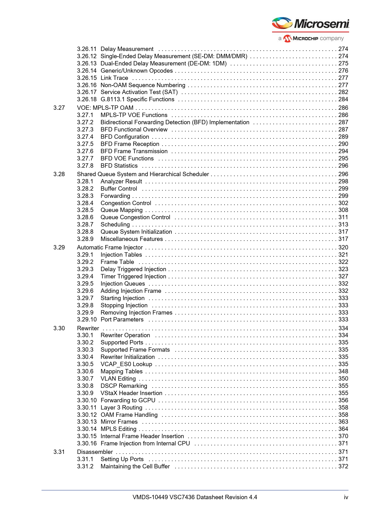该数据表的模型线 文件文字版本 link to page 294 link to page 294 link to page 295 link to page 296 link to page 297 link to page 297 link to page 302 link to page 304 link to page 306 link to page 306 link to page 307 link to page 307 link to page 309 link to page 310 link to page 314 link to page 315 link to page 316 link to page 316 link to page 318 link to page 319 link to page 319 link to page 322 link to page 328 link to page 331 link to page 333 link to page 337 link to page 337 link to page 340 link to page 341 link to page 342 link to page 343 link to page 347 link to page 352 link to page 352 link to page 353 link to page 353 link to page 353 link to page 353 link to page 354 link to page 354 link to page 355 link to page 355 link to page 355 link to page 355 link to page 368 link to page 370 link to page 375 link to page 375 link to page 376 link to page 378 link to page 378 link to page 383 link to page 384 link to page 390 link to page 391 link to page 391 link to page 391 link to page 392 3.26.11 Delay Measurement . 274 3.26.12 Single-Ended Delay Measurement (SE-DM: DMM/DMR) . 274 3.26.13 Dual-Ended Delay Measurement (DE-DM: 1DM) . 275 3.26.14 Generic/Unknown Opcodes . 276 3.26.15 Link Trace . 277 3.26.16 Non-OAM Sequence Numbering . 277 3.26.17 Service Activation Test (SAT) . 282 3.26.18 G.8113.1 Specific Functions . 284 3.27 VOE: MPLS-TP OAM . 286 3.27.1 MPLS-TP VOE Functions . 286 3.27.2 Bidirectional Forwarding Detection (BFD) Implementation . 287 3.27.3 BFD Functional Overview . 287 3.27.4 BFD Configuration . 289 3.27.5 BFD Frame Reception . 290 3.27.6 BFD Frame Transmission . 294 3.27.7 BFD VOE Functions . 295 3.27.8 BFD Statistics . 296 3.28 Shared Queue System and Hierarchical Scheduler . 296 3.28.1 Analyzer Result . 298 3.28.2 Buffer Control . 299 3.28.3 Forwarding . 299 3.28.4 Congestion Control . 302 3.28.5 Queue Mapping . 308 3.28.6 Queue Congestion Control . 311 3.28.7 Scheduling . 313 3.28.8 Queue System Initialization . 317 3.28.9 Miscellaneous Features . 317 3.29 Automatic Frame Injector . 320 3.29.1 Injection Tables . 321 3.29.2 Frame Table . 322 3.29.3 Delay Triggered Injection . 323 3.29.4 Timer Triggered Injection . 327 3.29.5 Injection Queues . 332 3.29.6 Adding Injection Frame . 332 3.29.7 Starting Injection . 333 3.29.8 Stopping Injection . 333 3.29.9 Removing Injection Frames . 333 3.29.10 Port Parameters . 333 3.30 Rewriter . 334 3.30.1 Rewriter Operation . 334 3.30.2 Supported Ports . 335 3.30.3 Supported Frame Formats . 335 3.30.4 Rewriter Initialization . 335 3.30.5 VCAP_ES0 Lookup . 335 3.30.6 Mapping Tables . 348 3.30.7 VLAN Editing . 350 3.30.8 DSCP Remarking . 355 3.30.9 VStaX Header Insertion . 355 3.30.10 Forwarding to GCPU . 356 3.30.11 Layer 3 Routing . 358 3.30.12 OAM Frame Handling . 358 3.30.13 Mirror Frames . 363 3.30.14 MPLS Editing . 364 3.30.15 Internal Frame Header Insertion . 370 3.30.16 Frame Injection from Internal CPU . 371 3.31 Disassembler . 371 3.31.1 Setting Up Ports . 371 3.31.2 Maintaining the Cell Buffer . 372 VMDS-10449 VSC7436 Datasheet Revision 4.4 iv Document Outline 1 Revision History 1.1 Revision 4.4 1.2 Revision 4.3 1.3 Revision 4.2 1.4 Revision 4.1 1.5 Revision 4.0 1.6 Revision 2.0 2 Product Overview 2.1 General Features 2.1.1 Layer 2 and Layer 3 Forwarding 2.1.2 Carrier Ethernet Support 2.1.3 Timing and Synchronization 2.1.4 Quality of Service 2.1.5 Security 2.1.6 Management 2.1.7 Product Parameters 2.2 Applications 2.2.1 Wireless Backhaul 2.2.2 Network Interface Device (NID) 2.2.3 Carrier Ethernet Switch with MPLS-TP 2.2.4 Small Cell Application 3 Functional Descriptions 3.1 Register Notations 3.2 Functional Overview 3.2.1 Frame Arrival in Ports and Port Modules 3.2.2 Basic Classification 3.2.3 Virtualized Service Aware Architecture (ViSAA™) 3.2.4 Security and Control Protocol Classification 3.2.5 Policing 3.2.6 Layer 2 Forwarding 3.2.7 Layer 3 Forwarding 3.2.8 Shared Queue System and Hierarchical Scheduler 3.2.9 Rewriter and Frame Departure 3.2.10 CPU Port Module 3.2.11 Synchronous Ethernet and Precision Time Protocol (PTP) 3.2.12 Ethernet and MPLS OAM 3.2.13 CPU Subsystem 3.3 Frame Headers 3.3.1 Internal Frame Header Placement 3.3.2 Internal Frame Header Layout 3.3.3 VStaX Header 3.4 Port Numbering and Mappings 3.4.1 Supported SerDes Interfaces 3.4.2 Dual-Media Mode 3.4.3 10G Modes 3.4.4 Logical Port Numbers 3.5 SERDES1G 3.6 SERDES6G 3.7 SERDES10G 3.8 Copper Transceivers 3.8.1 Register Access 3.8.2 Cat5 Twisted Pair Media Interface 3.8.3 Wake-On-LAN and SecureOn 3.8.4 Ethernet Inline Powered Devices 3.8.5 IEEE 802.3af PoE Support 3.8.6 ActiPHY™ Power Management 3.8.7 Testing Features 3.8.8 VeriPHY™ Cable Diagnostics 3.9 DEV1G and DEV2G5 Port Modules 3.9.1 MAC 3.9.2 Half-Duplex Mode 3.9.3 Physical Coding Sublayer (PCS) 3.9.4 Port Statistics 3.10 DEV10G Port Module 3.10.1 MAC 3.10.2 Physical Coding Sublayer (PCS) 3.10.3 Port Statistics 3.11 Assembler 3.11.1 Setting Up a Port in the Assembler 3.11.2 Setting Up a Port for Frame Injection 3.11.3 Setting Up MAC Control Sublayer PAUSE Frame Detection 3.11.4 Setting Up PFC 3.11.5 Setting Up Assembler Port Statistics 3.11.6 Setting Up the Loopback Path 3.12 Versatile Content-Aware Processor (VCAP) 3.12.1 Configuring VCAP 3.12.2 Wide VCAP Entries and Actions 3.12.3 Individual VCAPs 3.12.4 VCAP Programming Examples 3.13 Pipeline Points 3.13.1 Pipeline Definitions 3.14 Analyzer 3.14.1 Initializing the Analyzer 3.15 VCAP CLM Keys and Actions 3.15.1 Keys Overview 3.15.2 VCAP CLM X1 Key Details 3.15.3 VCAP CLM X2 Key Details 3.15.4 VCAP CLM X4 Key Details 3.15.5 VCAP CLM X8 Key Details 3.15.6 VCAP CLM X16 Key Details 3.15.7 VCAP CLM Actions 3.16 Analyzer Classifier 3.16.1 Basic Classifier 3.16.2 VCAP CLM Processing 3.16.3 QoS Mapping Table 3.16.4 Ingress Protection Table (IPT) 3.16.5 Layer 2 Control Protocol Processing 3.16.6 Y.1731 Ethernet MIP 3.16.7 Analyzer Classifier Diagnostics 3.17 VLAN and MSTP 3.17.1 Private VLAN 3.17.2 VLAN Pseudo Code 3.18 VCAP