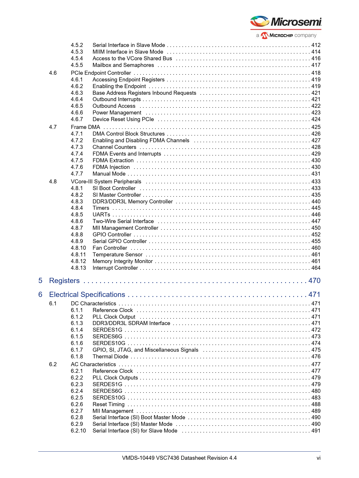该数据表的模型线 文件文字版本 link to page 432 link to page 434 link to page 436 link to page 437 link to page 438 link to page 439 link to page 439 link to page 441 link to page 441 link to page 442 link to page 443 link to page 444 link to page 445 link to page 446 link to page 447 link to page 448 link to page 449 link to page 450 link to page 450 link to page 451 link to page 453 link to page 453 link to page 455 link to page 460 link to page 465 link to page 466 link to page 467 link to page 470 link to page 472 link to page 475 link to page 480 link to page 481 link to page 481 link to page 484 link to page 490 link to page 491 link to page 491 link to page 491 link to page 491 link to page 491 link to page 492 link to page 493 link to page 494 link to page 495 link to page 496 link to page 497 link to page 497 link to page 499 link to page 499 link to page 500 link to page 503 link to page 508 link to page 509 link to page 510 link to page 510 link to page 511 4.5.2 Serial Interface in Slave Mode . 412 4.5.3 MIIM Interface in Slave Mode . 414 4.5.4 Access to the VCore Shared Bus . 416 4.5.5 Mailbox and Semaphores . 417 4.6 PCIe Endpoint Controller . 418 4.6.1 Accessing Endpoint Registers . 419 4.6.2 Enabling the Endpoint . 419 4.6.3 Base Address Registers Inbound Requests . 421 4.6.4 Outbound Interrupts . 421 4.6.5 Outbound Access . 422 4.6.6 Power Management . 423 4.6.7 Device Reset Using PCIe . 424 4.7 Frame DMA . 425 4.7.1 DMA Control Block Structures . 426 4.7.2 Enabling and Disabling FDMA Channels . 427 4.7.3 Channel Counters . 428 4.7.4 FDMA Events and Interrupts . 429 4.7.5 FDMA Extraction . 430 4.7.6 FDMA Injection . 430 4.7.7 Manual Mode . 431 4.8 VCore-III System Peripherals . 433 4.8.1 SI Boot Controller . 433 4.8.2 SI Master Controller . 435 4.8.3 DDR3/DDR3L Memory Controller . 440 4.8.4 Timers . 445 4.8.5 UARTs . 446 4.8.6 Two-Wire Serial Interface . 447 4.8.7 MII Management Controller . 450 4.8.8 GPIO Controller . 452 4.8.9 Serial GPIO Controller . 455 4.8.10 Fan Controller . 460 4.8.11 Temperature Sensor . 461 4.8.12 Memory Integrity Monitor . 461 4.8.13 Interrupt Controller . 464 5 Registers . 470 6 Electrical Specifications . 471 6.1 DC Characteristics . 471 6.1.1 Reference Clock . 471 6.1.2 PLL Clock Output . 471 6.1.3 DDR3/DDR3L SDRAM Interface . 471 6.1.4 SERDES1G . 472 6.1.5 SERDES6G . 473 6.1.6 SERDES10G . 474 6.1.7 GPIO, SI, JTAG, and Miscellaneous Signals . 475 6.1.8 Thermal Diode . 476 6.2 AC Characteristics . 477 6.2.1 Reference Clock . 477 6.2.2 PLL Clock Outputs . 479 6.2.3 SERDES1G . 479 6.2.4 SERDES6G . 480 6.2.5 SERDES10G . 483 6.2.6 Reset Timing . 488 6.2.7 MII Management . 489 6.2.8 Serial Interface (SI) Boot Master Mode . 490 6.2.9 Serial Interface (SI) Master Mode . 490 6.2.10 Serial Interface (SI) for Slave Mode . 491 VMDS-10449 VSC7436 Datasheet Revision 4.4 vi Document Outline 1 Revision History 1.1 Revision 4.4 1.2 Revision 4.3 1.3 Revision 4.2 1.4 Revision 4.1 1.5 Revision 4.0 1.6 Revision 2.0 2 Product Overview 2.1 General Features 2.1.1 Layer 2 and Layer 3 Forwarding 2.1.2 Carrier Ethernet Support 2.1.3 Timing and Synchronization 2.1.4 Quality of Service 2.1.5 Security 2.1.6 Management 2.1.7 Product Parameters 2.2 Applications 2.2.1 Wireless Backhaul 2.2.2 Network Interface Device (NID) 2.2.3 Carrier Ethernet Switch with MPLS-TP 2.2.4 Small Cell Application 3 Functional Descriptions 3.1 Register Notations 3.2 Functional Overview 3.2.1 Frame Arrival in Ports and Port Modules 3.2.2 Basic Classification 3.2.3 Virtualized Service Aware Architecture (ViSAA™) 3.2.4 Security and Control Protocol Classification 3.2.5 Policing 3.2.6 Layer 2 Forwarding 3.2.7 Layer 3 Forwarding 3.2.8 Shared Queue System and Hierarchical Scheduler 3.2.9 Rewriter and Frame Departure 3.2.10 CPU Port Module 3.2.11 Synchronous Ethernet and Precision Time Protocol (PTP) 3.2.12 Ethernet and MPLS OAM 3.2.13 CPU Subsystem 3.3 Frame Headers 3.3.1 Internal Frame Header Placement 3.3.2 Internal Frame Header Layout 3.3.3 VStaX Header 3.4 Port Numbering and Mappings 3.4.1 Supported SerDes Interfaces 3.4.2 Dual-Media Mode 3.4.3 10G Modes 3.4.4 Logical Port Numbers 3.5 SERDES1G 3.6 SERDES6G 3.7 SERDES10G 3.8 Copper Transceivers 3.8.1 Register Access 3.8.2 Cat5 Twisted Pair Media Interface 3.8.3 Wake-On-LAN and SecureOn 3.8.4 Ethernet Inline Powered Devices 3.8.5 IEEE 802.3af PoE Support 3.8.6 ActiPHY™ Power Management 3.8.7 Testing Features 3.8.8 VeriPHY™ Cable Diagnostics 3.9 DEV1G and DEV2G5 Port Modules 3.9.1 MAC 3.9.2 Half-Duplex Mode 3.9.3 Physical Coding Sublayer (PCS) 3.9.4 Port Statistics 3.10 DEV10G Port Module 3.10.1 MAC 3.10.2 Physical Coding Sublayer (PCS) 3.10.3 Port Statistics 3.11 Assembler 3.11.1 Setting Up a Port in the Assembler 3.11.2 Setting Up a Port for Frame Injection 3.11.3 Setting Up MAC Control Sublayer PAUSE Frame Detection 3.11.4 Setting Up PFC 3.11.5 Setting Up Assembler Port Statistics 3.11.6 Setting Up the Loopback Path 3.12 Versatile Content-Aware Processor (VCAP) 3.12.1 Configuring VCAP 3.12.2 Wide VCAP Entries and Actions 3.12.3 Individual VCAPs 3.12.4 VCAP Programming Examples 3.13 Pipeline Points 3.13.1 Pipeline Definitions 3.14 Analyzer 3.14.1 Initializing the Analyzer 3.15 VCAP CLM Keys and Actions 3.15.1 Keys Overview 3.15.2 VCAP CLM X1 Key Details 3.15.3 VCAP CLM X2 Key Details 3.15.4 VCAP CLM X4 Key Details 3.15.5 VCAP CLM X8 Key Details 3.15.6 VCAP CLM X16 Key Details 3.15.7 VCAP CLM Actions 3.16 Analyzer Classifier 3.16.1 Basic Classifier 3.16.2 VCAP CLM Processing 3.16.3 QoS Mapping Table 3.16.4 Ingress Protection Table (IPT) 3.16.5 Layer 2 Control Protocol Processing 3.16.6 Y.1731 Ethernet MIP 3.16.7 Analyzer Classifier Diagnostics 3.17 VLAN and MSTP 3.17.1 Private VLAN 3.17.2 VLAN Pseudo Code 3.18 VCAP LPM: Keys and Action 3.18.1 VCAP LPM SGL_IP4 Key Details 3.18.2 VCAP LPM DBL_IP4 Key Details 3.18.3 VCAP LPM SGL_IP6 Key Details 3.18.4 VCAP LPM DBL_IP6 Key Details 3.18.5 VCAP LPM Actions 3.19 IP Processing 3.19.1 IP S