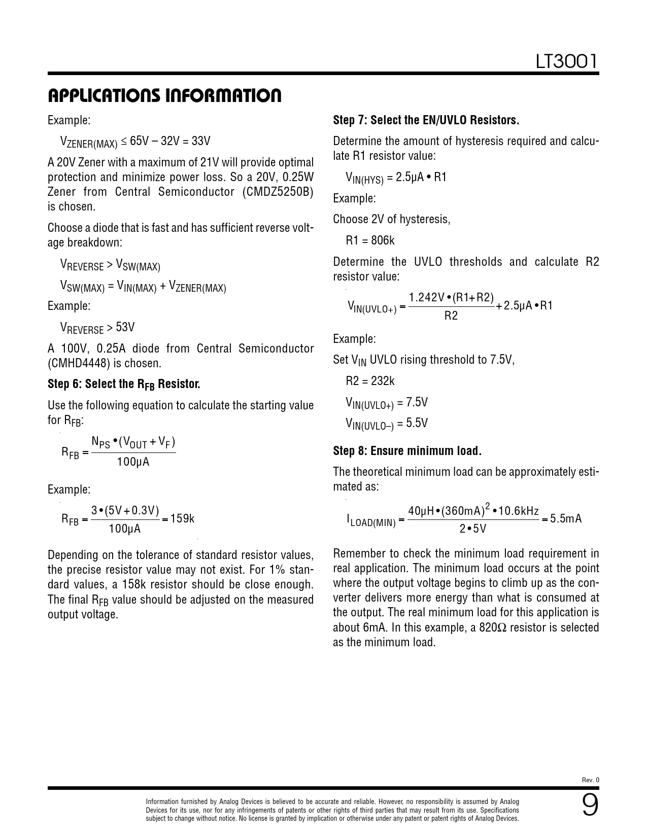 APPLICATIONS INFORMATION. Step 7: Select the EN/UVLO Resistors. Step 6: Select the R. FB Resistor. Step 8: Ensure minimum load