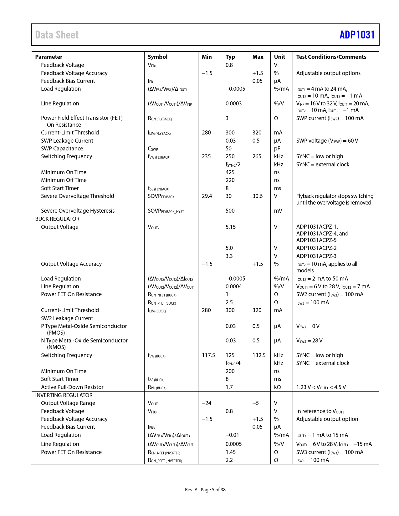 页数 / 页38 / 5 — Data Sheet. ADP1031. Parameter. Symbol. Min. Typ. Max. Unit. Test …
