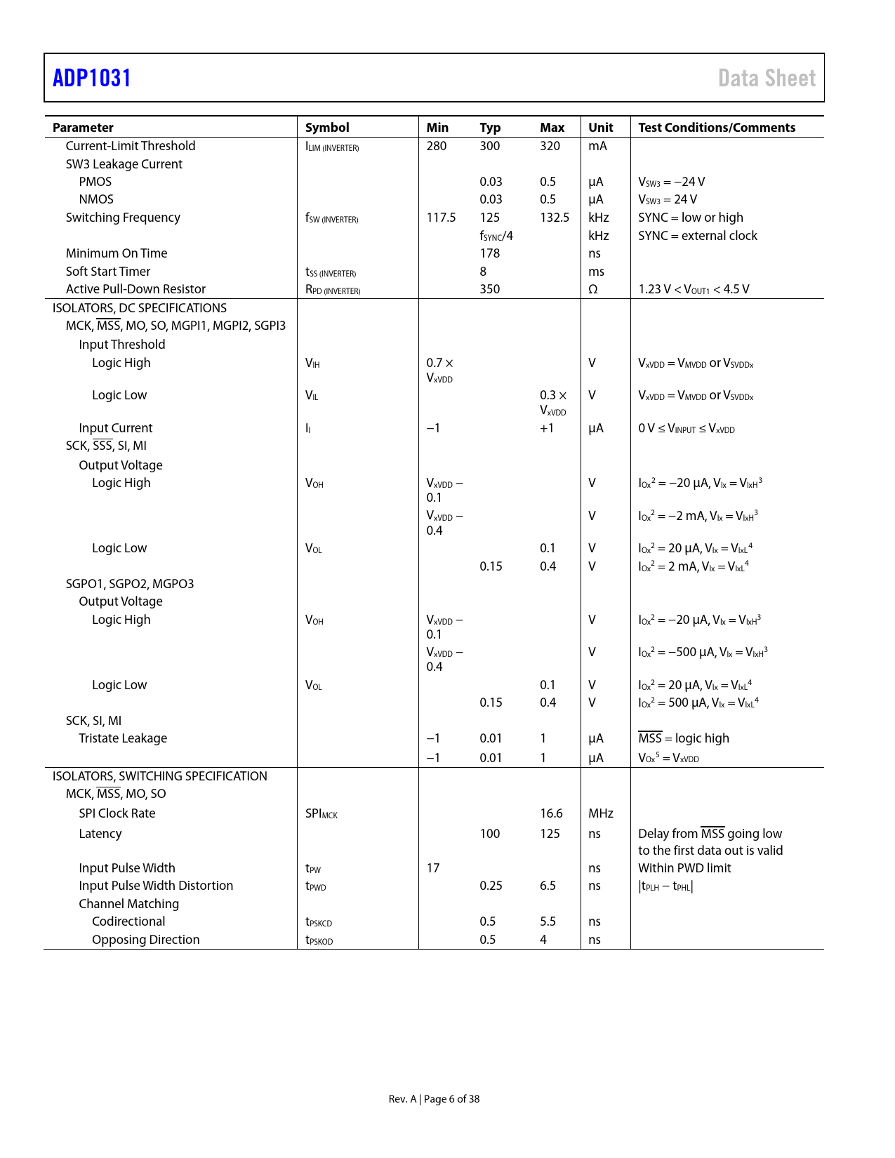 | 页数 / 页 | 38 / 6 — ADP1031. Data Sheet. Parameter. Symbol. Min. Typ. Max. Unit. Test … |