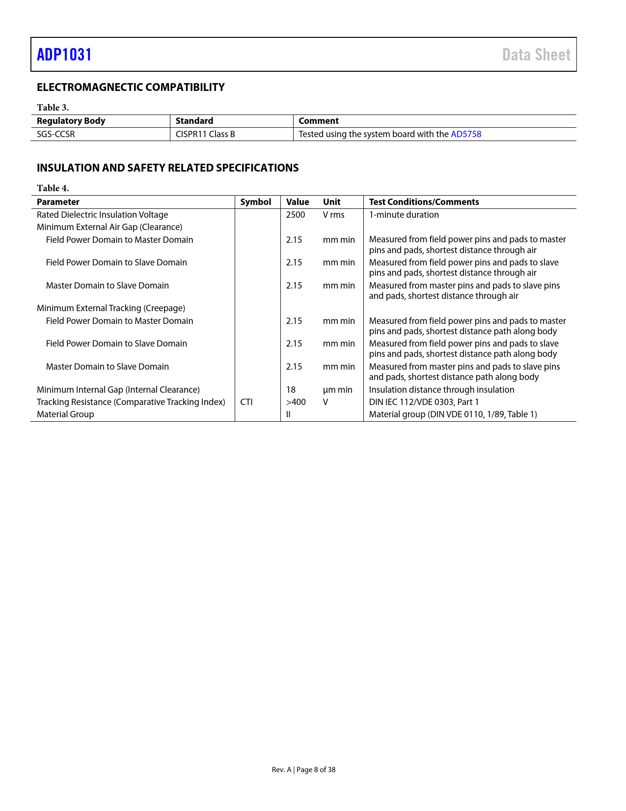 页数 / 页38 / 8 — ADP1031. Data Sheet. ELECTROMAGNECTIC COMPATIBILITY. Table 3. Regulatory …