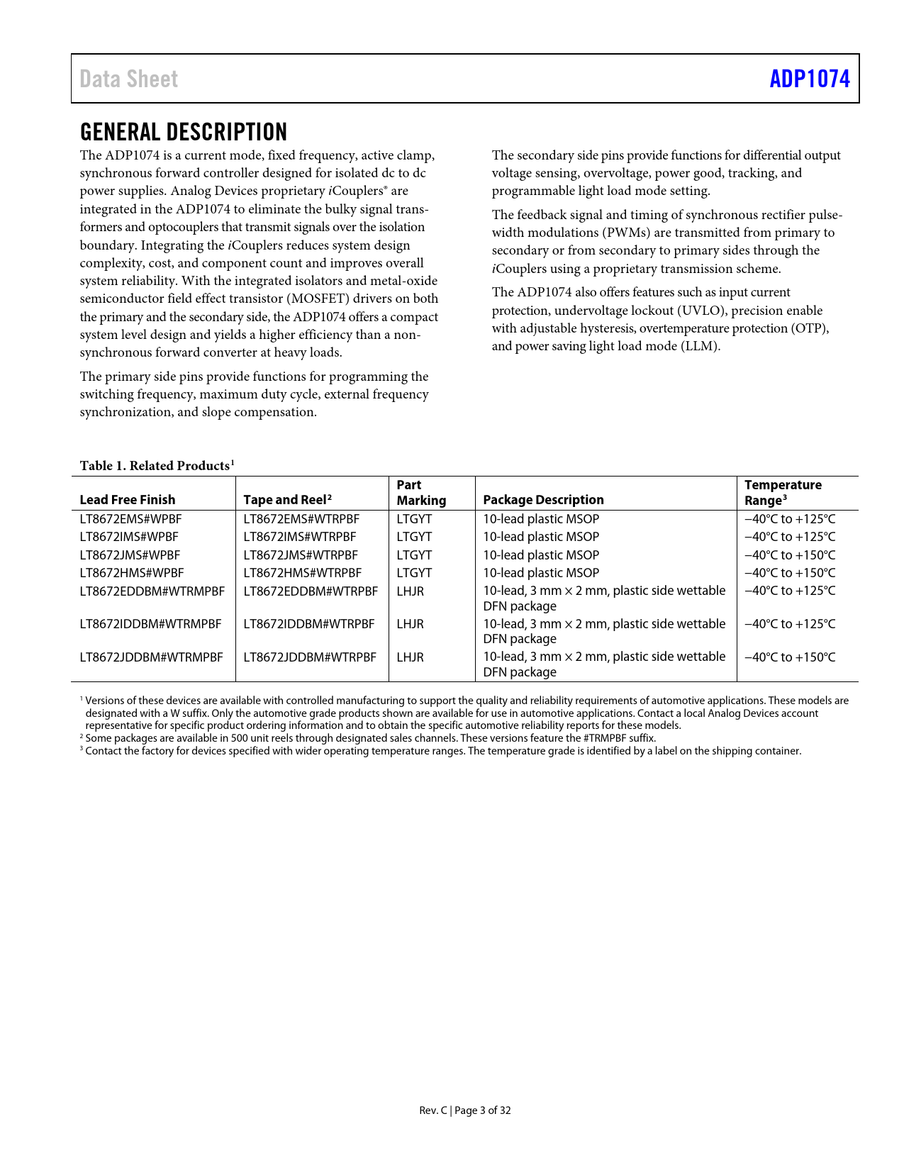 Data SheetADP1074GENERAL DESCRIPTION The ADP1074 is a current mode, fixed frequency, active clamp, The secondary side pins provide functions for differential output synchronous forward control er designed for isolated dc to dc voltage sensing, overvoltage, power good, tracking, and power supplies. Analog Devices proprietary iCouplers® are programmable light load mode setting. integrated in the ADP1074 to eliminate the bulky signal trans- The feedback signal and timing of synchronous rectifier pulse- formers and optocouplers that transmit signals over the isolation width modulations (PWMs) are transmitted from primary to boundary. Integrating the iCouplers reduces system design secondary or from secondary to primary sides through the complexity, cost, and component count and improves overal iCouplers using a proprietary transmission scheme. system reliability. With the integrated isolators and metal-oxide semiconductor field effect transistor (MOSFET) drivers on both The ADP1074 also offers features such as input current the primary and the secondary side, the ADP1074 offers a compact protection, undervoltage lockout (UVLO), precision enable system level design and yields a higher efficiency than a non- with adjustable hysteresis, overtemperature protection (OTP), synchronous forward converter at heavy loads. and power saving light load mode (LLM). The primary side pins provide functions for programming the switching frequency, maximum duty cycle, external frequency synchronization, and slope compensation. Table 1. Related Products1PartTemperatureLead Free FinishTape and Reel2MarkingPackage DescriptionRange3 LT8672EMS#WPBF LT8672EMS#WTRPBF LTGYT 10-lead plastic MSOP −40°C to +125°C LT8672IMS#WPBF LT8672IMS#WTRPBF LTGYT 10-lead plastic MSOP −40°C to +125°C LT8672JMS#WPBF LT8672JMS#WTRPBF LTGYT 10-lead plastic MSOP −40°C to +150°C LT8672HMS#WPBF LT8672HMS#WTRPBF LTGYT 10-lead plastic MSOP −40°C to +150°C LT8672EDDBM#WTRMPBF LT8672EDDBM#WTRPBF LHJR 10-lead, 3 mm × 2 mm, plastic side wettable −40°C to +125°C DFN package LT8672IDDBM#WTRMPBF LT8672IDDBM#WTRPBF LHJR 10-lead, 3 mm × 2 mm, plastic side wettable −40°C to +125°C DFN package LT8672JDDBM#WTRMPBF LT8672JDDBM#WTRPBF LHJR 10-lead, 3 mm × 2 mm, plastic side wettable −40°C to +150°C DFN package 1 Versions of these devices are available with controlled manufacturing to support the quality and reliability requirements of automotive applications. These models are designated with a W suffix. Only the automotive grade products shown are available for use in automotive applications. Contact a local Analog Devices account representative for specific product ordering information and to obtain the specific automotive reliability reports for these models. 2 Some packages are available in 500 unit reels through designated sales channels. These versions feature the #TRMPBF suffix. 3 Contact the factory for devices specified with wider operating temperature ranges. The temperature grade is identified by a label on the shipping container. Rev. C | Page 3 of 32 Document Outline FEATURES APPLICATIONS SIMPLIFIED BLOCK DIAGRAM TABLE OF CONTENTS REVISION HISTORY GENERAL DESCRIPTION SPECIFICATIONS INSULATION AND SAFETY RELATED SPECIFICATIONS REGULATORY INFORMATION DIN V VDE V 0884-10 (VDE V 0884-10) INSULATION CHARACTERISTICS DIN V VDE V 0884-10 (VDE V 0884-10) INSULATION CHARACTERISTICS ABSOLUTE MAXIMUM RATINGS THERMAL RESISTANCE ESD CAUTION PIN CONFIGURATIONS AND FUNCTION DESCRIPTIONS TYPICAL PERFORMANCE CHARACTERISTICS THEORY OF OPERATION DETAILED BLOCK DIAGRAM PRIMARY SIDE SUPPLY, INPUT VOLTAGE, AND LDO SECONDARY SIDE SUPPLY AND LDO PRECISION ENABLE SOFT START PROCEDURE OUTPUT VOLTAGE SENSING AND FEEDBACK LOOP COMPENSATION AND STEADY STATE OPERATION SLOPE COMPENSATION INPUT/OUTPUT CURRENT-LIMIT PROTECTION TEMPERATURE SENSING FREQUENCY SETTING (RT PIN) MAXIMUM DUTY CYCLE FREQUENCY SYNCHRONIZATION SYNCHRONOUS RECTIFIER (SR) DRIVERS OUTPUT OVERVOLTAGE PROTECTION (OVP) ACTIVE CLAMP (PGATE) LEADING EDGE BLANKING GATE DELAY AND SR DEAD TIME LIGHT LOAD MODE (LLM) AND SR PHASE IN EXTERNAL START-UP CIRCUIT SOFT STOP POWER GOOD OCP/FEEDBACK RECOVERY OUTPUT VOLTAGE TRACKING REMOTE SYSTEM RESET OCP COUNTER INSULATION LIFETIME LAYOUT GUIDELINES TYPICAL APPLICATION CIRCUITS OUTLINE DIMENSIONS ORDERING GUIDE NOTES