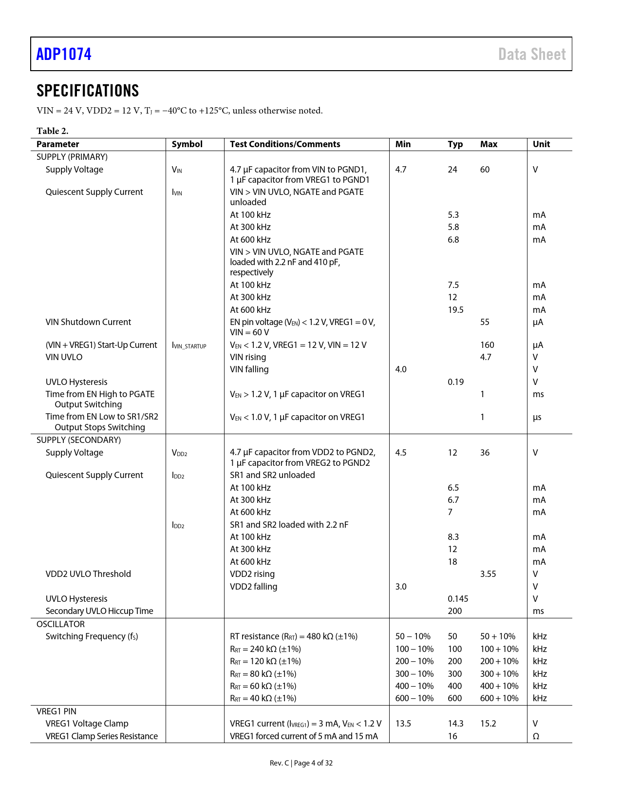 ADP1074Data SheetSPECIFICATIONS VIN = 24 V, VDD2 = 12 V, TJ = −40°C to +125°C, unless otherwise noted. Table 2. ParameterSymbolTest Conditions/CommentsMinTypMaxUnit SUPPLY (PRIMARY) Supply Voltage VIN 4.7 µF capacitor from VIN to PGND1, 4.7 24 60 V 1 µF capacitor from VREG1 to PGND1 Quiescent Supply Current IVIN VIN > VIN UVLO, NGATE and PGATE unloaded At 100 kHz 5.3 mA At 300 kHz 5.8 mA At 600 kHz 6.8 mA VIN > VIN UVLO, NGATE and PGATE loaded with 2.2 nF and 410 pF, respectively At 100 kHz 7.5 mA At 300 kHz 12 mA At 600 kHz 19.5 mA VIN Shutdown Current EN pin voltage (VEN) < 1.2 V, VREG1 = 0 V, 55 μA VIN = 60 V (VIN + VREG1) Start-Up Current IVIN_STARTUP VEN < 1.2 V, VREG1 = 12 V, VIN = 12 V 160 μA VIN UVLO VIN rising 4.7 V VIN falling 4.0 V UVLO Hysteresis 0.19 V Time from EN High to PGATE VEN > 1.2 V, 1 µF capacitor on VREG1 1 ms Output Switching Time from EN Low to SR1/SR2 VEN < 1.0 V, 1 µF capacitor on VREG1 1 μs Output Stops Switching SUPPLY (SECONDARY) Supply Voltage VDD2 4.7 µF capacitor from VDD2 to PGND2, 4.5 12 36 V 1 µF capacitor from VREG2 to PGND2 Quiescent Supply Current IDD2 SR1 and SR2 unloaded At 100 kHz 6.5 mA At 300 kHz 6.7 mA At 600 kHz 7 mA IDD2 SR1 and SR2 loaded with 2.2 nF At 100 kHz 8.3 mA At 300 kHz 12 mA At 600 kHz 18 mA VDD2 UVLO Threshold VDD2 rising 3.55 V VDD2 falling 3.0 V UVLO Hysteresis 0.145 V Secondary UVLO Hiccup Time 200 ms OSCILLATOR Switching Frequency (fS) RT resistance (RRT) = 480 kΩ (±1%) 50 − 10% 50 50 + 10% kHz RRT = 240 kΩ (±1%) 100 − 10% 100 100 + 10% kHz RRT = 120 kΩ (±1%) 200 − 10% 200 200 + 10% kHz RRT = 80 kΩ (±1%) 300 − 10% 300 300 + 10% kHz RRT = 60 kΩ (±1%) 400 − 10% 400 400 + 10% kHz RRT = 40 kΩ (±1%) 600 − 10% 600 600 + 10% kHz VREG1 PIN VREG1 Voltage Clamp VREG1 current (IVREG1) = 3 mA, VEN < 1.2 V 13.5 14.3 15.2 V VREG1 Clamp Series Resistance VREG1 forced current of 5 mA and 15 mA 16 Ω Rev. C | Page 4 of 32 Document Outline FEATURES APPLICATIONS SIMPLIFIED BLOCK DIAGRAM TABLE OF CONTENTS REVISION HISTORY GENERAL DESCRIPTION SPECIFICATIONS INSULATION AND SAFETY RELATED SPECIFICATIONS REGULATORY INFORMATION DIN V VDE V 0884-10 (VDE V 0884-10) INSULATION CHARACTERISTICS DIN V VDE V 0884-10 (VDE V 0884-10) INSULATION CHARACTERISTICS ABSOLUTE MAXIMUM RATINGS THERMAL RESISTANCE ESD CAUTION PIN CONFIGURATIONS AND FUNCTION DESCRIPTIONS TYPICAL PERFORMANCE CHARACTERISTICS THEORY OF OPERATION DETAILED BLOCK DIAGRAM PRIMARY SIDE SUPPLY, INPUT VOLTAGE, AND LDO SECONDARY SIDE SUPPLY AND LDO PRECISION ENABLE SOFT START PROCEDURE OUTPUT VOLTAGE SENSING AND FEEDBACK LOOP COMPENSATION AND STEADY STATE OPERATION SLOPE COMPENSATION INPUT/OUTPUT CURRENT-LIMIT PROTECTION TEMPERATURE SENSING FREQUENCY SETTING (RT PIN) MAXIMUM DUTY CYCLE FREQUENCY SYNCHRONIZATION SYNCHRONOUS RECTIFIER (SR) DRIVERS OUTPUT OVERVOLTAGE PROTECTION (OVP) ACTIVE CLAMP (PGATE) LEADING EDGE BLANKING GATE DELAY AND SR DEAD TIME LIGHT LOAD MODE (LLM) AND SR PHASE IN EXTERNAL START-UP CIRCUIT SOFT STOP POWER GOOD OCP/FEEDBACK RECOVERY OUTPUT VOLTAGE TRACKING REMOTE SYSTEM RESET OCP COUNTER INSULATION LIFETIME LAYOUT GUIDELINES TYPICAL APPLICATION CIRCUITS OUTLINE DIMENSIONS ORDERING GUIDE NOTES